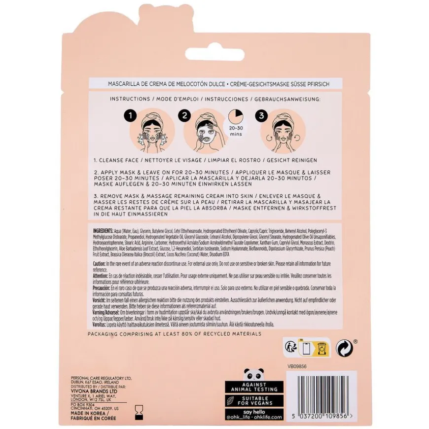 Peach & Coconut Water Cream Sheet Mask er en ansiktmaske for fukt og glød. Inspirert av koreanske hudpleierutiner gir denne masken huden din en kombinasjon av fuktighet og glød. Beriket med vitaminrik kokosnøttvann og intensivt fuktende ferskenekstrakt, former denne masken seg perfekt rundt ansiktet ditt for å effektivt nære huden din.