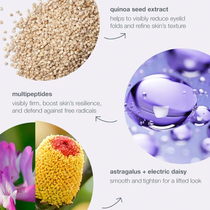 - Quinoa frøekstrakt forbedrer hudteksturen og reduserer folder på øyelokket.