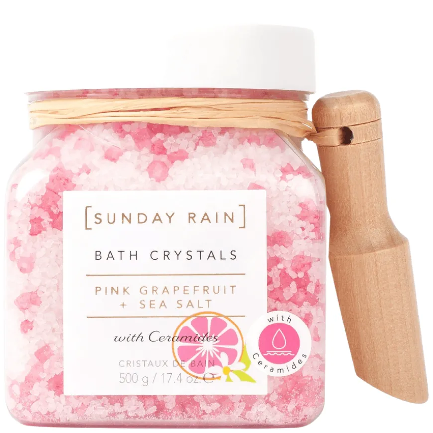 Pink Grapefruit & Sea Salt Bath Crystals fra Sunday Rain er luksuriøse badesalt som gir en avslappende og forfriskende badeopplevelse. Beriket med havsalt og ceramider, hjelper de med å lindre trøtte muskler samtidig som huden blir myk, glatt og fuktet. Den oppkvikkende duften av rosa grapefrukt, søt appelsin og frisk sitron forvandler badet ditt til en sanselig spa-opplevelse. Perfekt for å roe ned etter en lang dag og gi kroppen en velfortjent pause.