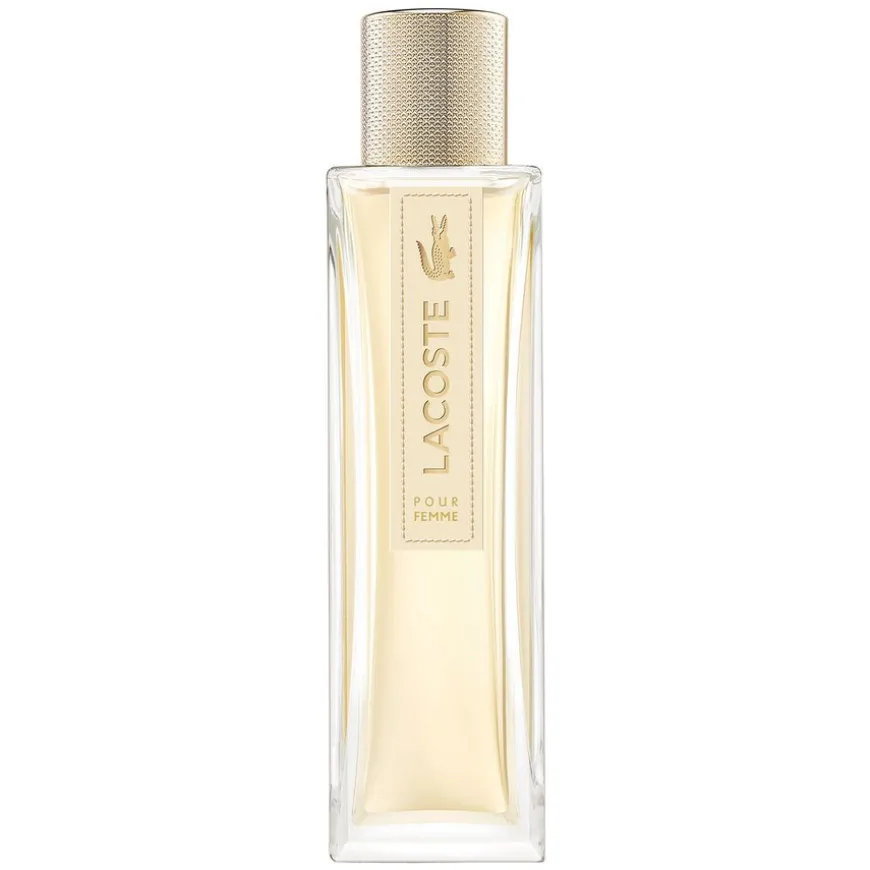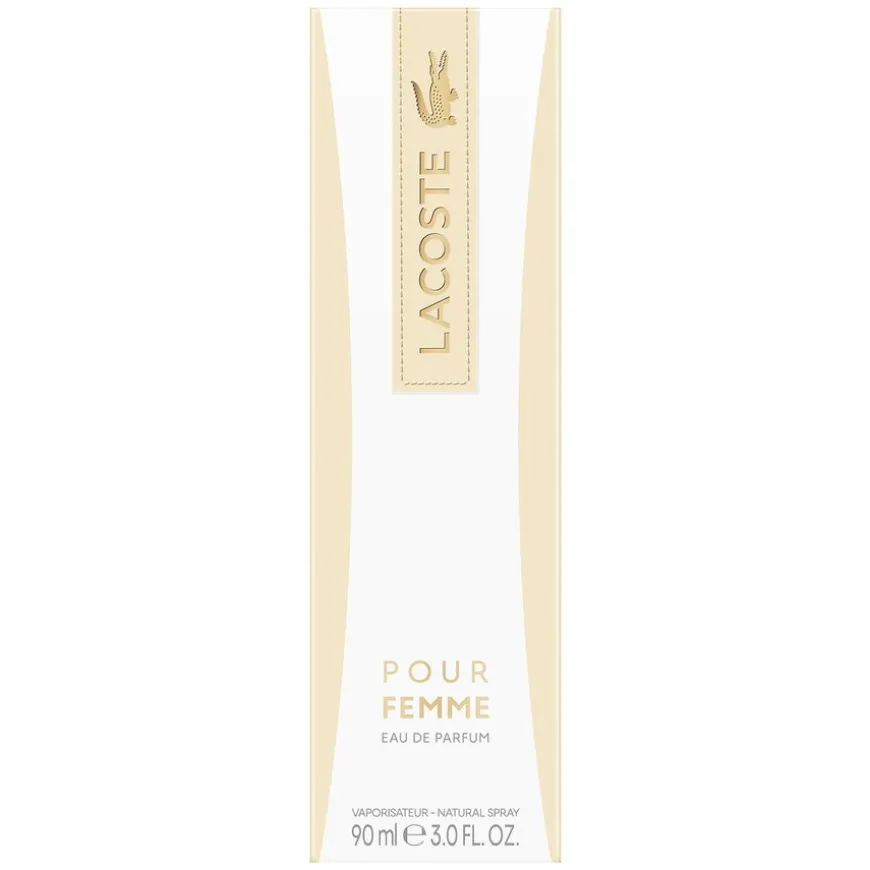 Pour Femme Eau de Parfum, legemliggjør den frie ånden til dagens kvinner. Denne floral treaktige duften for kvinner åpner med fresia og krydret pepper. Det feminine hjertet avslører en blomsterakkord av heliotrop, sjasmin og rose. Til slutt gir det varme kjærtegnet av sedertre og semsket skinn struktur og eleganse til denne signaturduften. Lacoste Pour Femme-flasken skiller seg ut for sin slanke silhuett: en totem for moderne kvinner. Den ytre emballasjen har timeglassformen på flasken i en harmoni av beige, gull og hvite nyanser.
