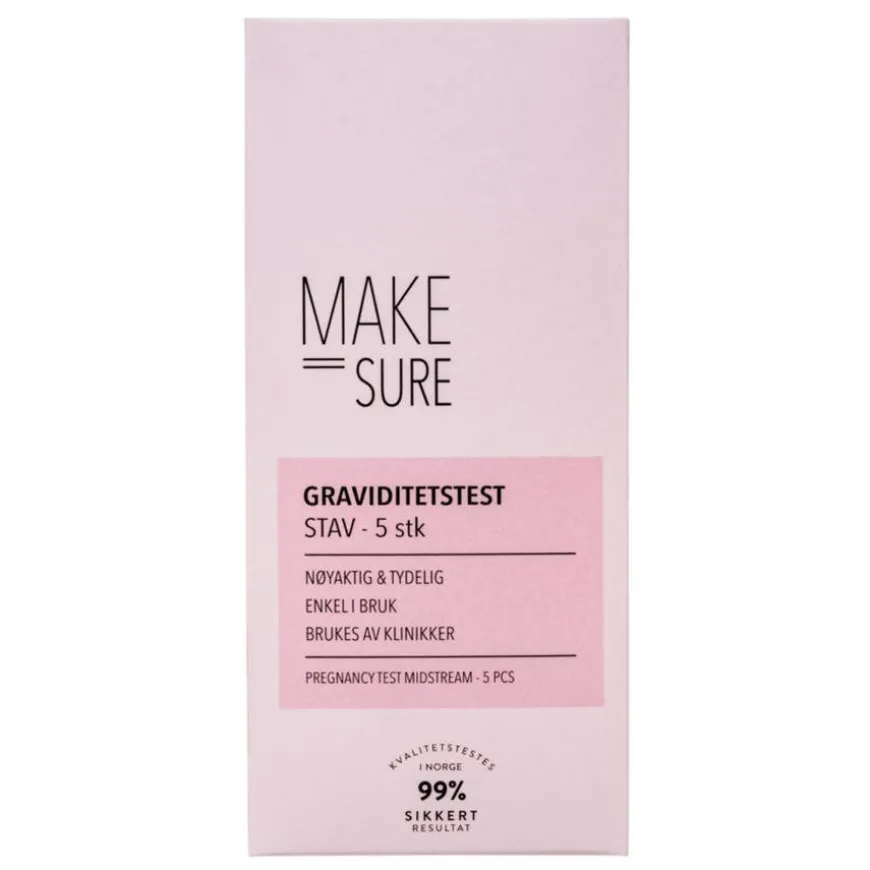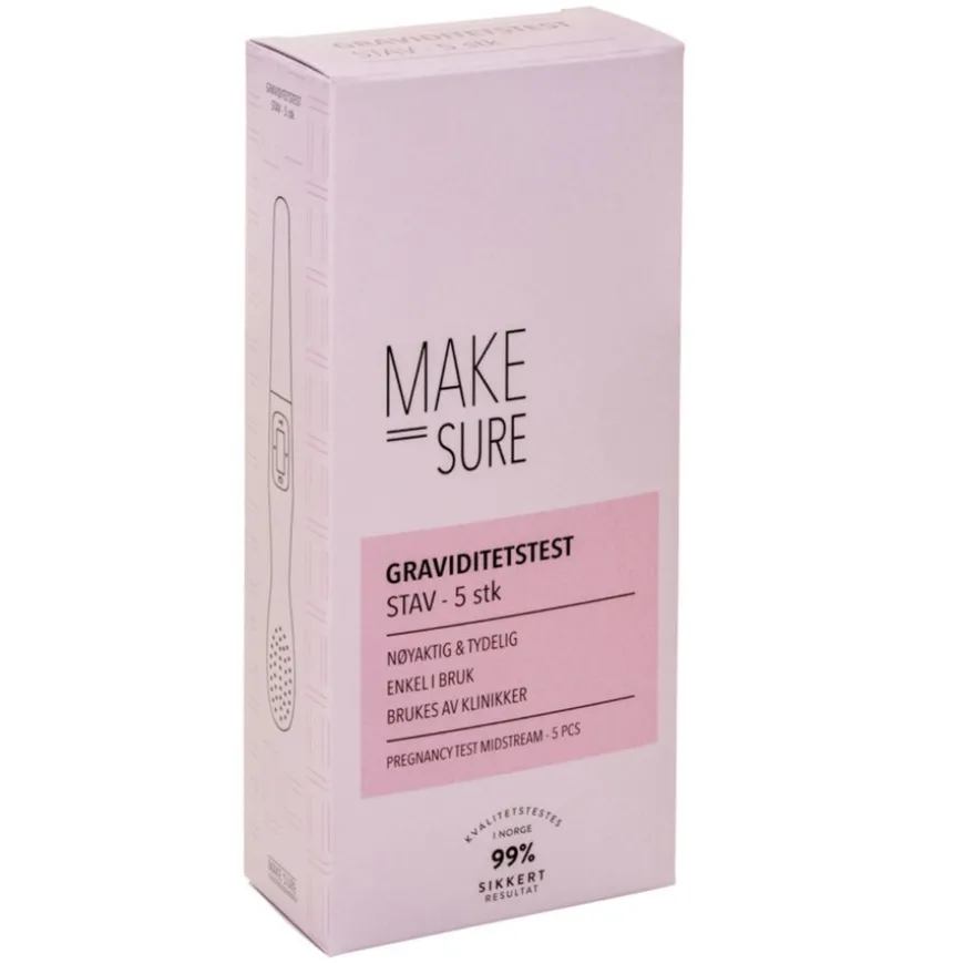 Make Sure-serien er designet og kvalitetstestet i Norge, og er spesielt utviklet for de som prøver å bli gravide og trenger å teste ofte. Testene er rimelige, og du kan velge mellom strimmel- og stavtester. Produktene testes jevnlig i norske laboratorier for å sikre optimal kvalitet. Testene er CE-godkjent i Europa og FDA-godkjent i USA.