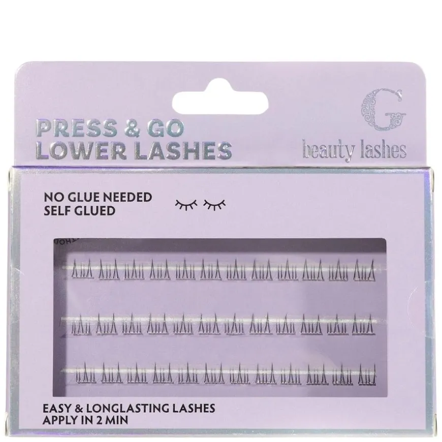 Press & Go Lower Lashes er selvklebende vipper som ikke krever klissete lim. Du fester dem enkelt ved å plassere én vippebit om gangen på dine naturlige undervipper. Du kan enten fylle ut mellomrom eller dekke hele vippekanten, avhengig av ønsket effekt. Vippene kan brukes med eller uten mascara, avhengig av tettheten og tykkelsen på dine egne vipper.