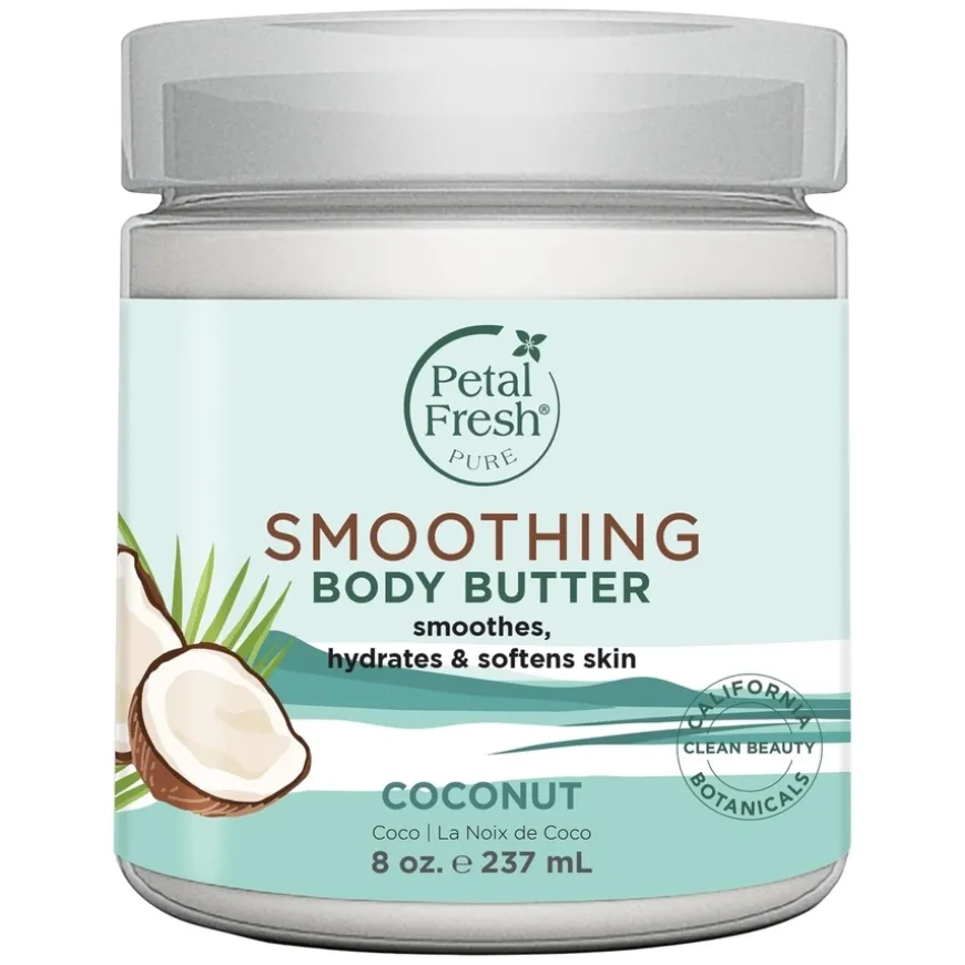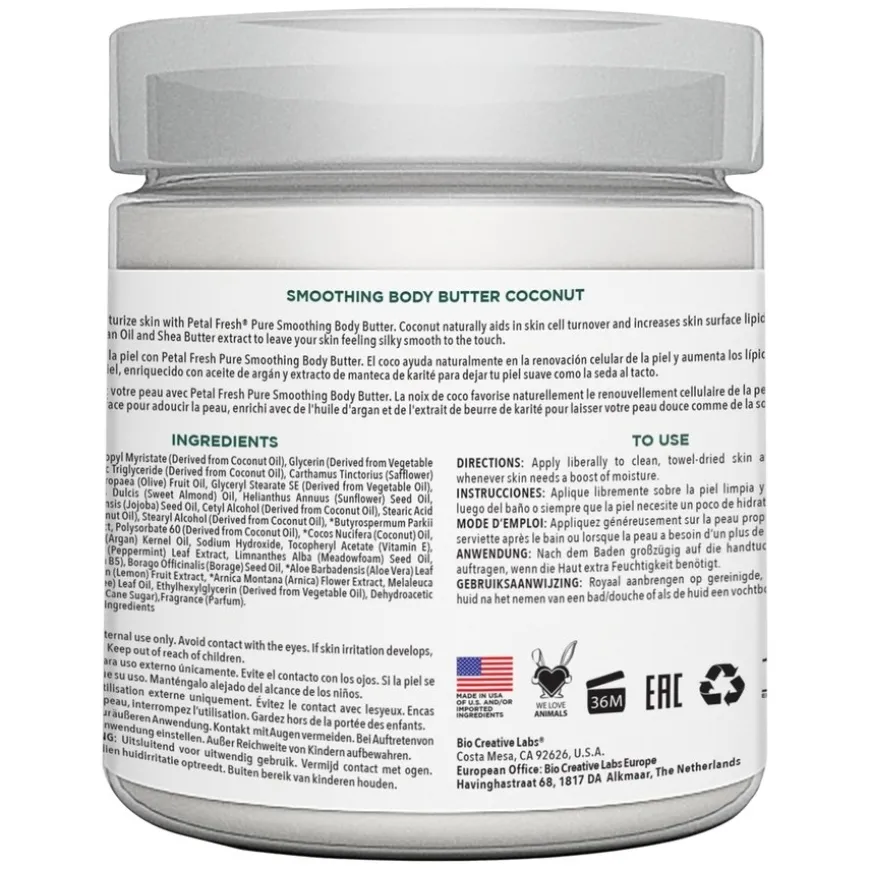Coconut Smoothing Body Butter er en luksuriøs kroppskrem som gir intensiv fuktighet og glatter ut huden. Kroppskremen inneholder sertifisert organisk kokos, som fungerer som en naturlig eksfoliant og bidrar til å øke hudens overflate-lipider for å mykgjøre og pleie huden. Den rike formelen er også beriket med arganolje og sheasmør, som gjør huden silkemyk og velpleid. Perfekt for de som ønsker en dypt fuktighetsgivende og utjevnende behandling.