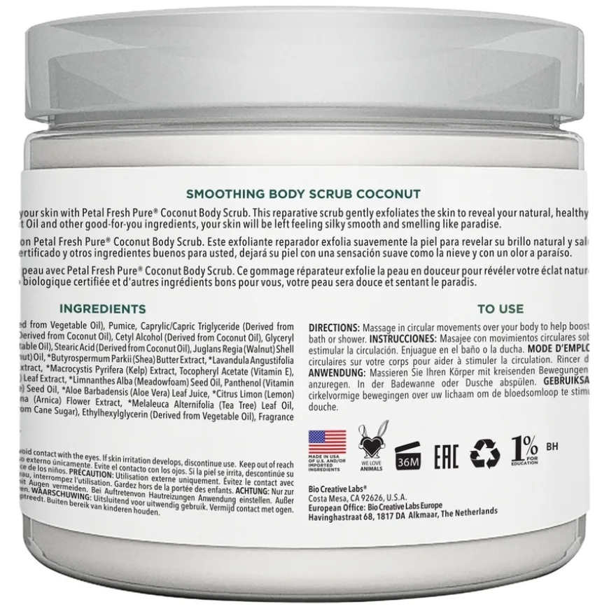 Coconut Smoothing Body Scrub er en skånsom kroppsskrubb som eksfolierer og fukter huden for å fremheve dens naturlige, sunne glød. Skrubben er beriket med sertifisert organisk kokosolje, som gir intens fuktighet og etterlater huden silkemyk og glatt. Denne reparerende formelen fjerner døde hudceller og gir huden en herlig duft av kokos, perfekt for deg som ønsker en luksuriøs eksfoliering som etterlater huden frisk, velpleid og strålende.