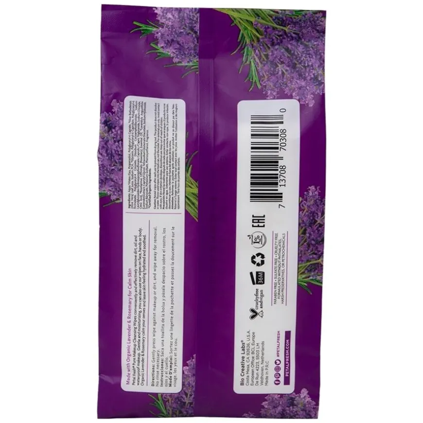 Lavender & Rosemary Makeup Removing Wipes er skånsomme våtservietter som effektivt fjerner smuss, olje og selv vannfast sminke fra ansikt, hender eller kropp. Formulert med organisk lavendel og rosmarin, bidrar disse serviettene til å roe sansene og etterlate huden hydrert og beroliget. Perfekte for daglig bruk eller når du er på farten, gir de en behagelig opplevelse og frisker opp huden.
