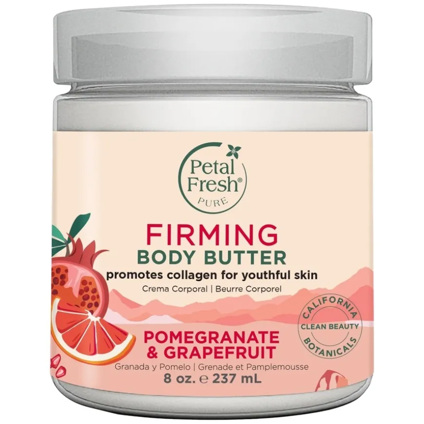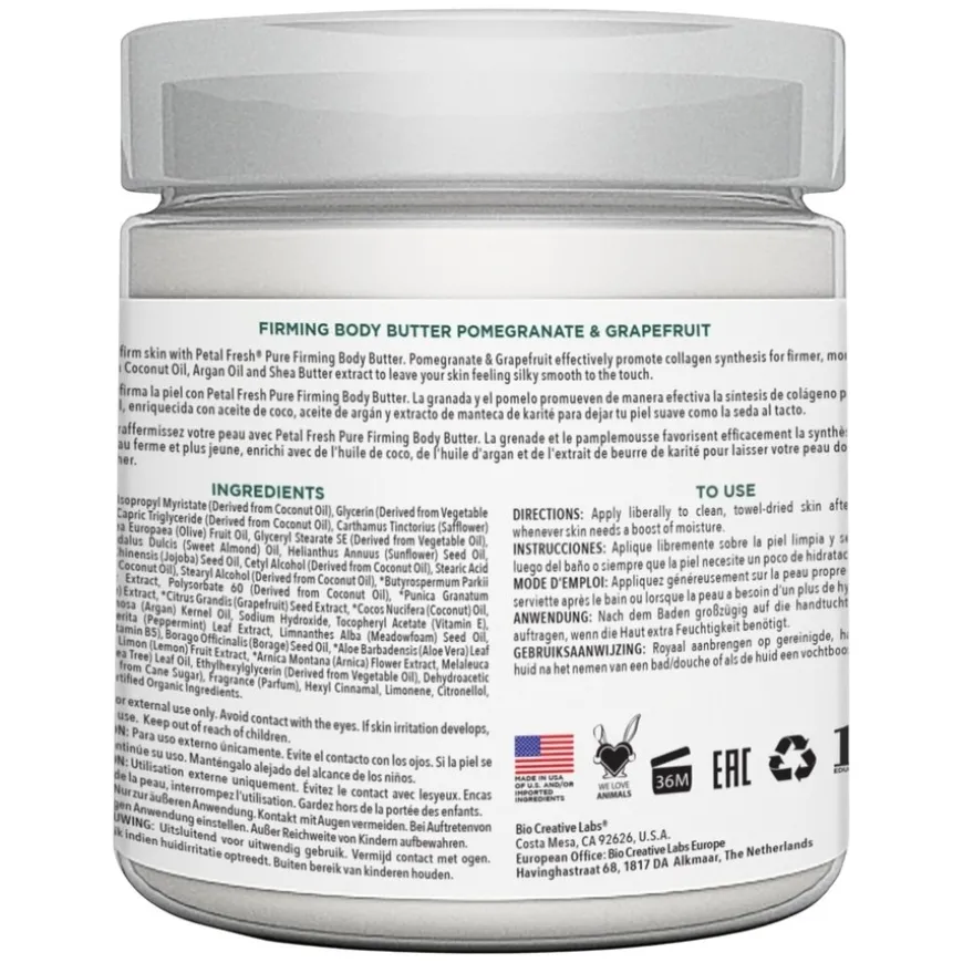Pomegranate & Grapefruit Firming Body Butter er en rik og nærende kroppskrem som fukter og strammer opp huden. Produktet inneholder sertifisert organisk granateple og grapefrukt, som effektivt fremmer kollagensyntese for fastere og mer elastisk hud. Den kremete formelen er også beriket med Coconut Oil Complex – en eksotisk blanding av kokosolje, arganolje og sheasmør, som etterlater huden silkemyk og glatt. Perfekt for de som ønsker både fuktighet og en fastere hudtekstur.