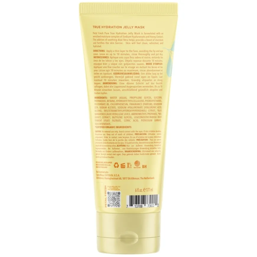True Hydration Jelly Mask Honey er en intensiv fuktighetsgivende ansiktsmaske formulert med et beriket fuktighetskompleks av natriumhyaluronat og honningekstrakt, som hjelper huden med å holde på fuktigheten og etterlater den frisk og beroliget. Masken er også tilsatt aloe vera, som gir ekstra fuktighet og bidrar til å styrke hudbarrieren, noe som gjør huden mer motstandsdyktig mot ytre påvirkninger. Etter bruk vil huden føles ren, hydrert og fornyet. Perfekt for alle hudtyper, spesielt tørr og sensitiv hud.
