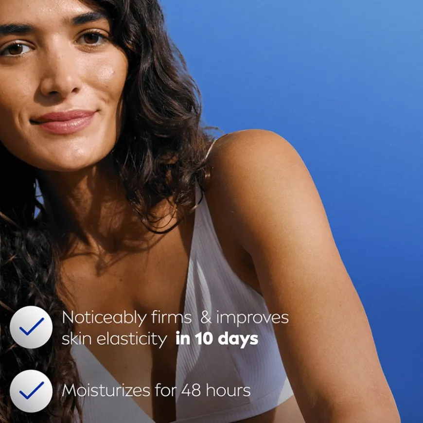 Q10 Firming Body Lotion er en bodylotion som er beriket med kollagenboostkompleks (kompleks testet in vitro på hudceller) og inneholder 99,5 % ren Q10 og vitamin C. Hudkremen styrker og forbedrer hudens elastisitet merkbart på 10 dager. Den pleiende formulaen tilfører huden fuktighetspleie i 48 timer og etterlater en behagelig duft. NIVEA bodylotion er dermatologisk testet og er velegnet til normal hud. Ny og forbedret flaske med mindre plast enn tidligere: 50 % resirkulert plastflaske (unntatt kork). Den oppstrammende og intensivt fuktighetsgivende formulaen er velegnet til daglig bruk. Oppdag NIVEA Q10 Vitamin C Body Lotion nå og få merkbart fastere og fuktighetspleiet hud!