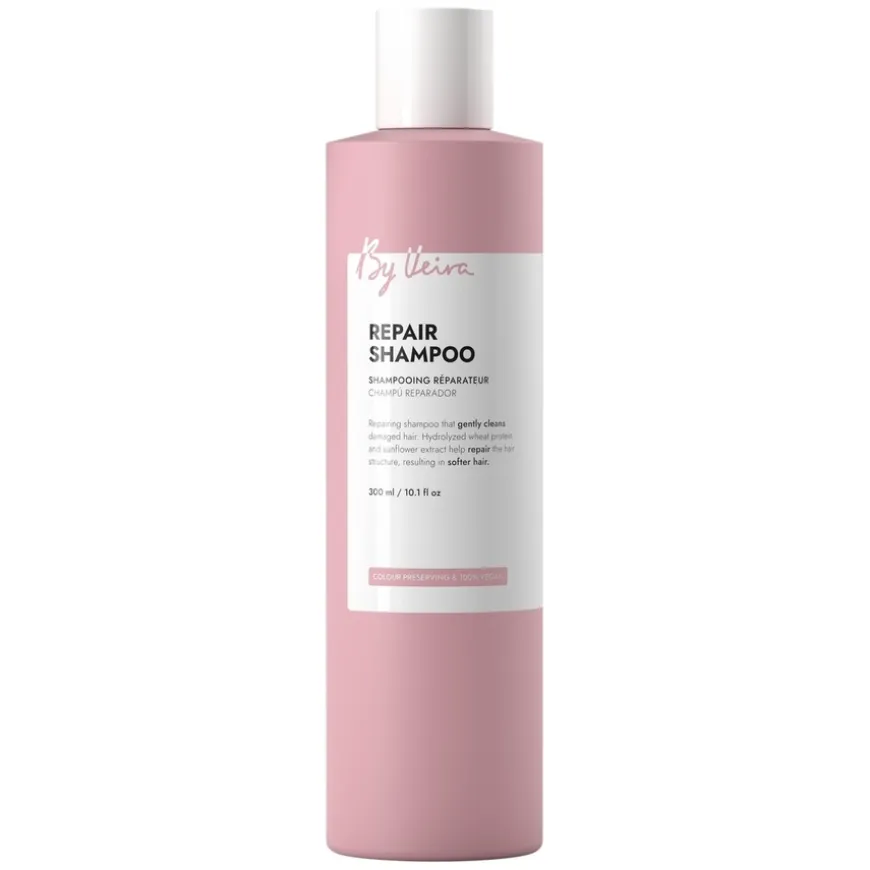 BY VEIRA Repair Shampoo er en reparerende sjampo som skånsomt renser og gjenoppbygger skadet hår. Den er spesielt utviklet for kjemisk behandlet og slitt hår, og inneholder hydrolysert hveteprotein og solsikkeekstrakt for å tilføre fuktighet og styrke hårets struktur. Sjampoen bidrar til å bevare hårfargen, samtidig som den er 100% vegansk.