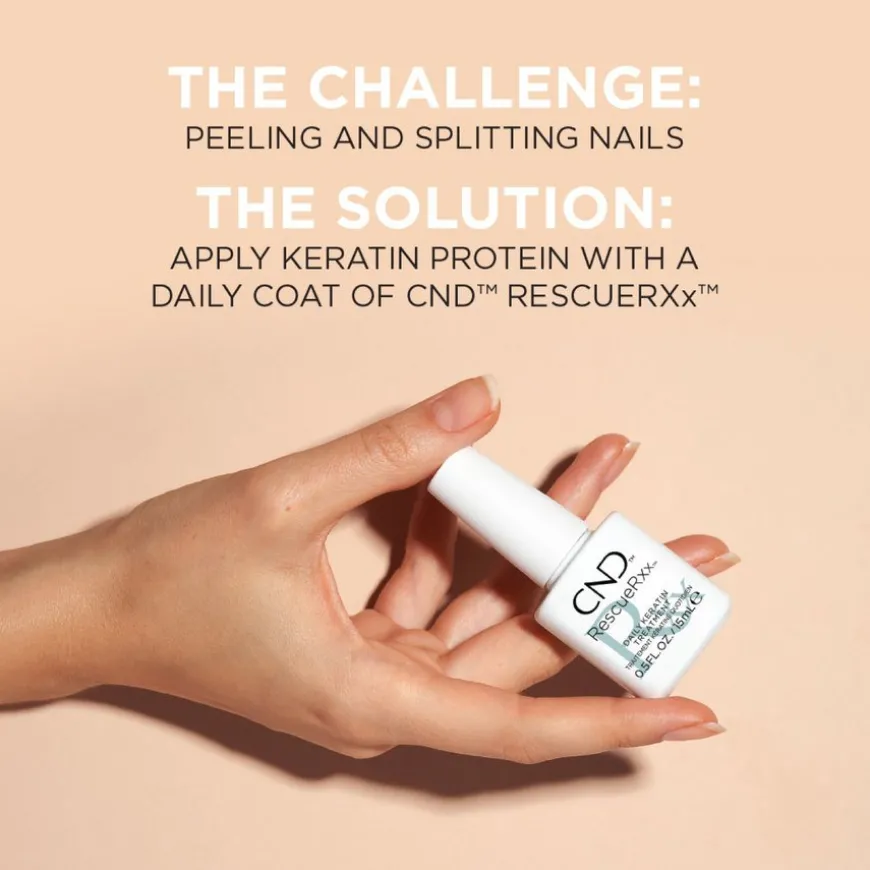 RescueRXx Daily Keratin Treatment er eneffektiv keratinbehandling som gir pleie og styrke til svake og skadde naturnegler ved hjelp av keratinprotein og fuktighetsgivende jojobaolje. Ved daglig bruk i opptil 4 uker merkes en kraftig reduksjon av hvite flekker, sprekker, filsing og deling, samt at neglen oppleves tykkere og jevnere.