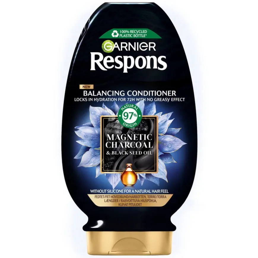 Oppdag en ny rutine med rensende kull og nigellafrøolje. Garnier Respons Magnetic Charcoal Conditioner er en balsam som er utviklet for å skape balanse i hår med tendens til tørre lengder og fet hodebunn. Den veganske formelen* består av 97 % ingredienser av naturlig opprinnelse og binder fukt i håret i 72 timer** uten at det føles fett eller tungt Flasken er laget av 100 % resirkulert plast** og er resirkulerbar. Garnier er offisielt godkjent av Cruelty Free International under Leaping Bunny-programmet.