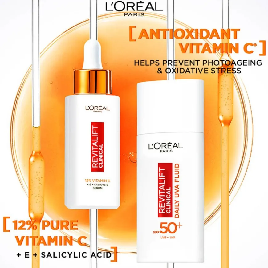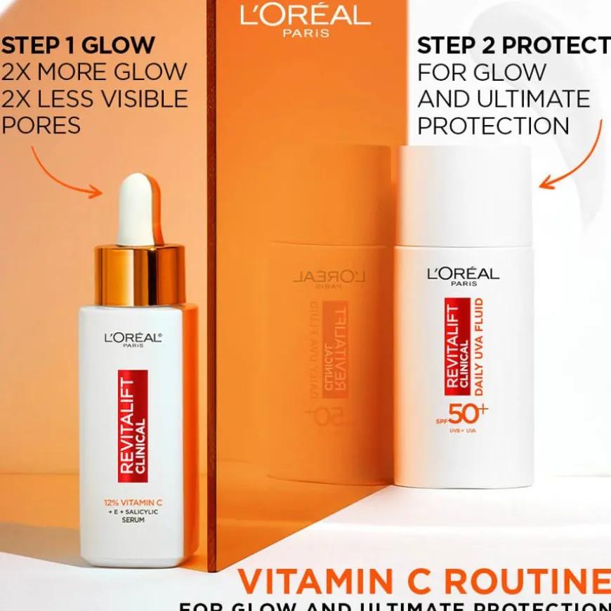 Maksimer hudens glød og beskytt den samtidig mot UV-stråler med L’Oréal Paris Revitalift Clinical 12% Vitamin C Serum og L’Oréal Paris Revitalift Clinical Daily Moisturising Fluid SPF50. Revitalift Clinical Vitamin C serum er et ansiktsserum som gir huden din glød. Det er beriket med 12 % rent vitamin C*, vitamin E og salisylsyre for effektivt å motvirke ujevn hudtone, synlige porer og fine linjer. Etter en måned er huden din to ganger mer strålende og tre ganger glattere. Revitalift Clinical Daily SPF50 dagkrem er beriket med C-vitamin og bidrar til å forebygge solinduserte aldringstegn som rynker og pigmentflekker.