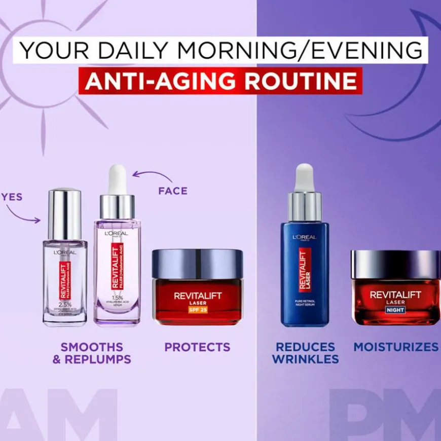 Prøv en anti-age-rutine som gir resultater med L’Oréal Paris Revitalift Filler 1,5 % hyaluronsyreserum og Revitalift Laser Pure Retinol Night Serum. Revitalift Filler er et fuktighetsgivende antirynkeserum som påføres om morgenen og passer for alle hudtyper. Beriket med en høy konsentrasjon av hyaluronsyre, glyserin og planteekstraktet fibroxyl. Revitalift Laser Retinol Serum virker over natten og gir en betydelig reduksjon av rynker og en finere hudstruktur. Etter 1 måned: Hudteksturen er forfinet, ser yngre ut og føles mer strålende*.