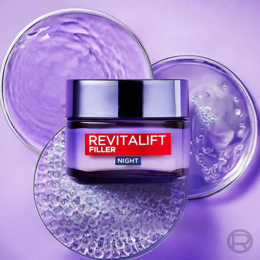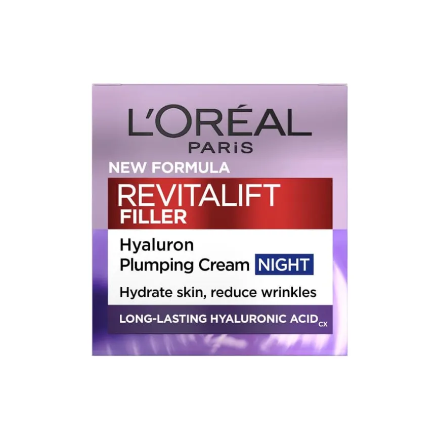 L’Oréal Paris Revitalift Filler Nattkrem er en avansert nattkrem beriket med høy konsentrasjon av hyaluronsyre, glyserin og planteekstraktet galanga. Den bidrar til å redusere rynker og tretthetstegn, forbedre hudens volum og styrke dens naturlige barrierefunksjon. Når du våkner om morgenen, føles huden intenst fuktet og smidig. Etter 4 uker oppleves rynker og tretthetstegn som redusert*. Hudens overflate virker jevnere, kinnene fyldigere og huden på halsen mindre slapp.