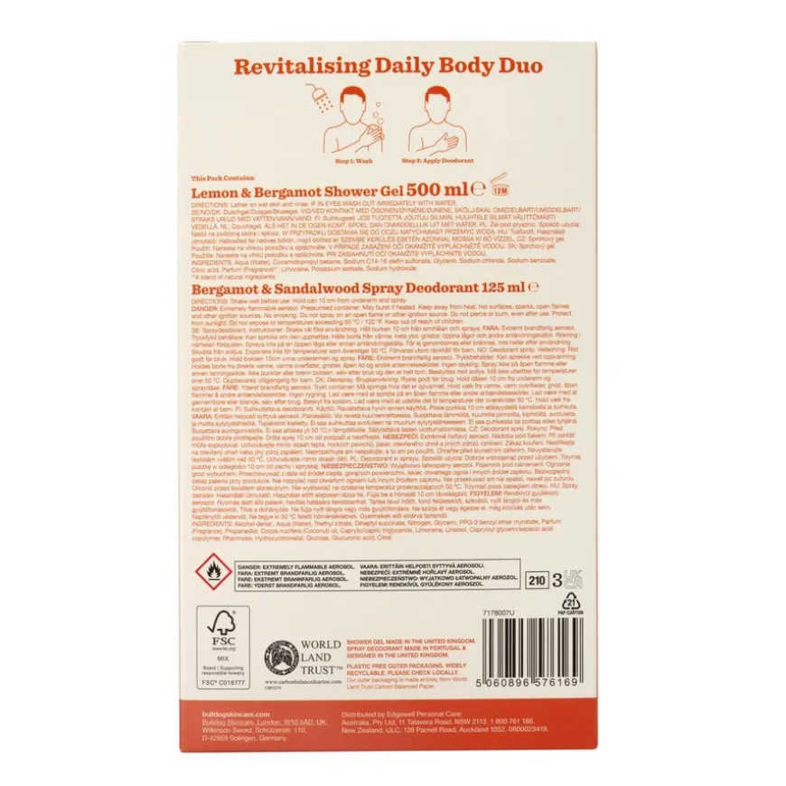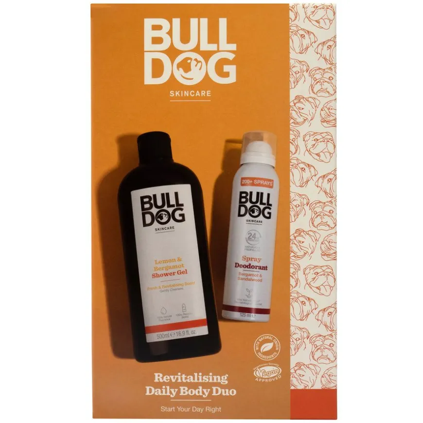 Revitalising Daily Body Duo er en gaveeske fra Bulldog som inneholder sine bestselgere: Lemon & Bergamot Shower Gel og Bergamot & Sandalwood Spray Deodorant.