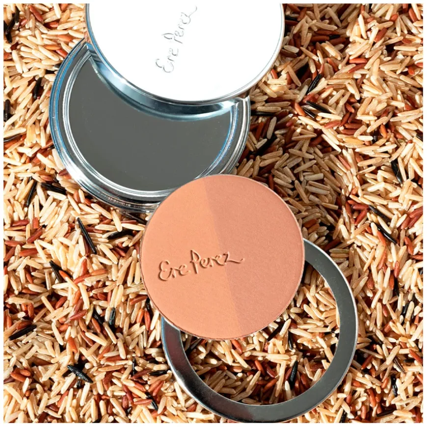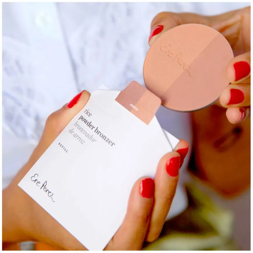 Rice Powder Blush & Bronzer er en kombinasjon av blush og bronzer i refill format. Presset pudder laget av rispulver som gir ansiktet en naturlig farge og sunn glød. Det tilpasningsdyktige fargeduetten passer til flere hudtoner. Pustende konsistens som ikke tetter porene. Denne fantastiske kombinasjonen tilfører dybde av farge og en frisk, sunn glød – alt i ett! Den pustende, luksuriøse formelen gir en silkemyk finish. Den er skånsom mot sensitiv hud og garantert å holde hele dagen, takket være den oljeabsorberende risstivelsesbasen. Ere Perez har tilsatt vitamin E og kamille i formelen for en beroligende og lysnende effekt. Alle nyansene passer for alle hudtyper. Roma gir en subtil ferskenblush og en lett kobberbronse som varmer opp enhver hudtone. Nå tilgjengelig i refill format.