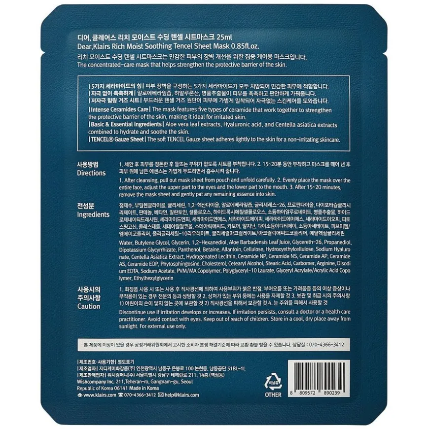 En dypt fuktighetsgivende og beroligende sheet mask i materialet tencel. Den legger seg tett på huden og passer sensitiv hud bra. Masken inneholder blant annet cermider som styrker hudbarrieren, fuktighetsgivende panthenol (vitamin B5) og beroligende aloe vera, lakrisrotekstrakt og centella asiatica. Den fukter, reparerer og styrker en skadet hudbarriere.