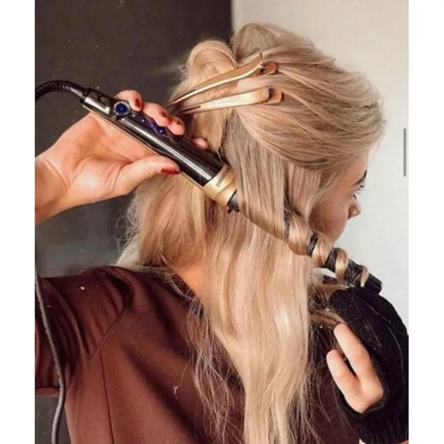 - Tvist håret rundt krøllstaven, start innerst med røttene, og hold noen sekunder.