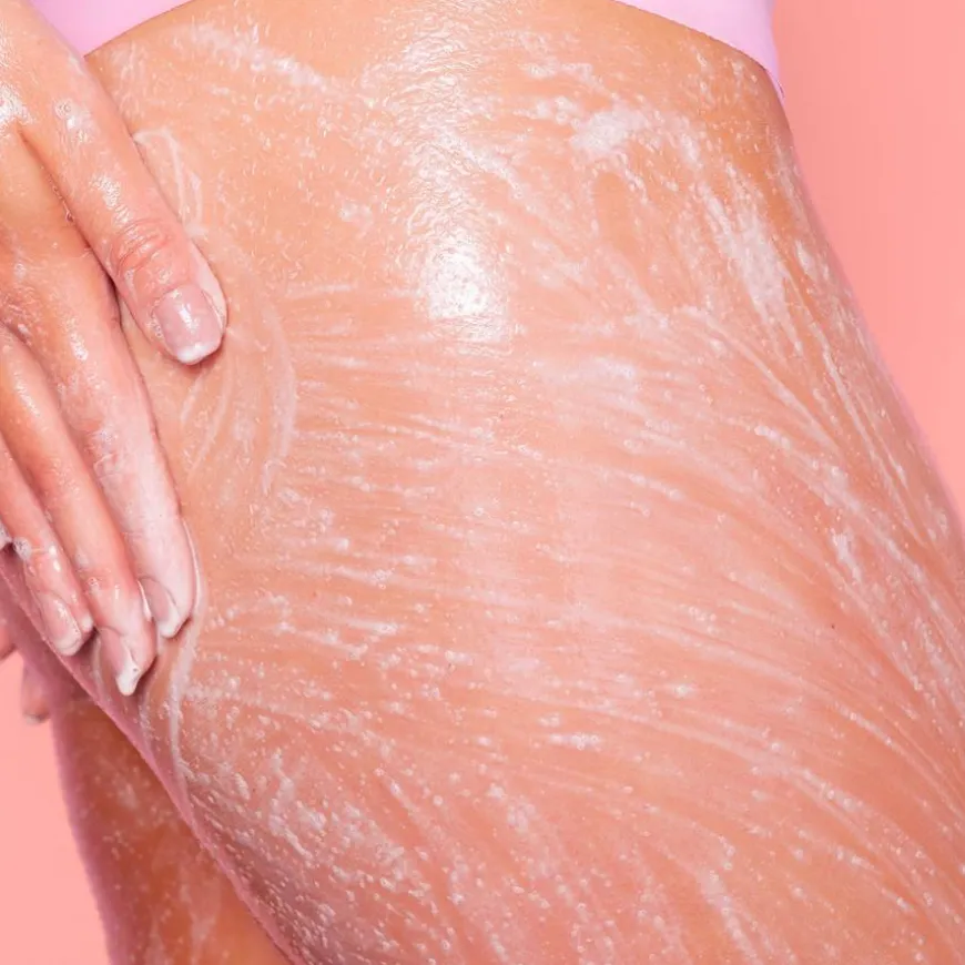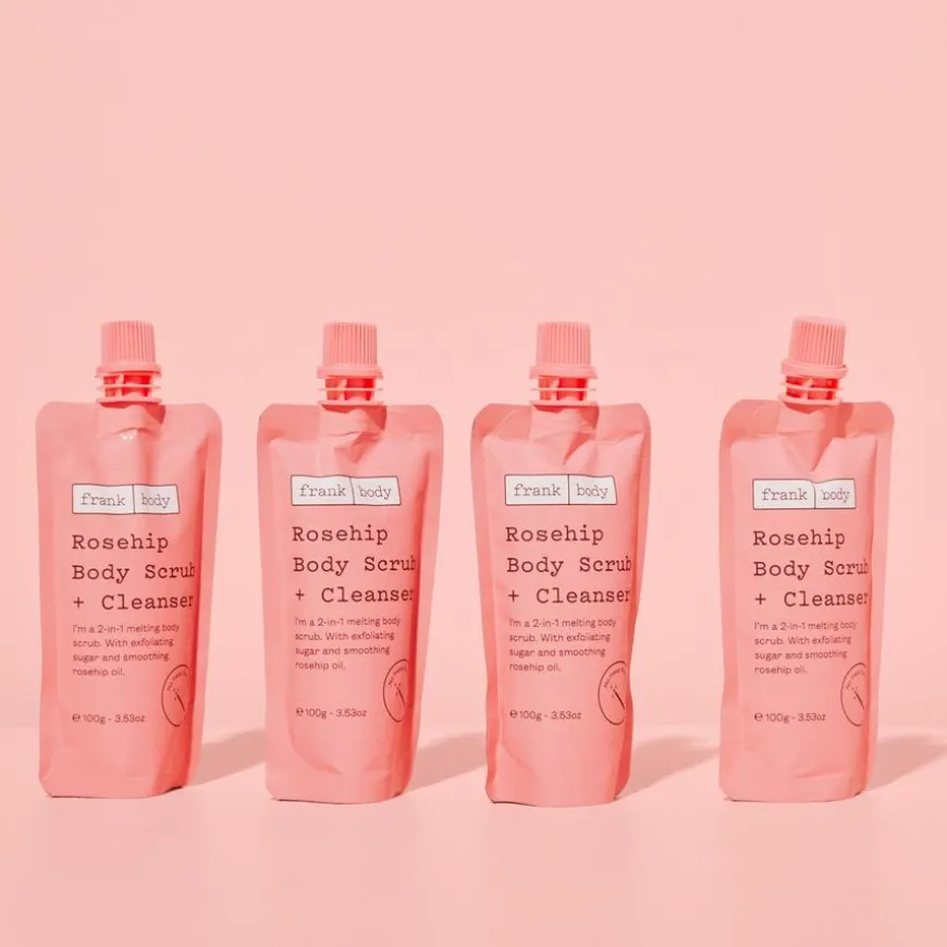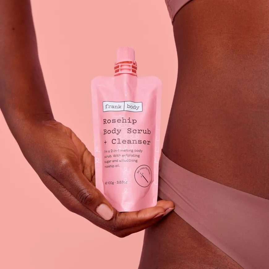 Frank Body Rosehip Body Scrub & Cleanser er en vegansk 2-i-1 skrubb som smelter til en myk, skummende rens, mens den gir en mild skrubb for å fjerne tørrhet og gi næring, også til sensitive hudtyper. Etterlater huden myk og glatt, takket være en blanding av nyperoseolje, kaffebønneekstrakt og lavendelolje. Bruk den over hele kroppen for en silkemyk hud med glød, og fokuser på områder utsatt for merker og arr for å myke opp og dempe disse.