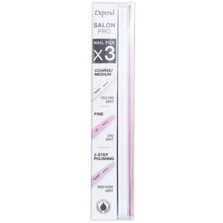 Depend Salon Pro Nail File x3 er et sett med tre neglfiler og den profesjonelle manikyristens drømmefiler for både rett lengde og superglans. Laget av profesjonelt materiale som gir filen ekstra lang levetid. Filene kan vaskes og desinfiseres.