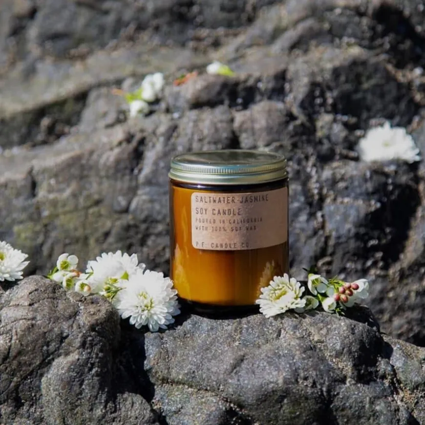 P.F. Candle Co. Saltwater Jasmine Standard Soy Candle er inspirert av kystens rolige morgener, med en frisk og ren duft av bergamott, sjøgress og sandeltre. Duftkombinasjonen fremmer ro og velvære, perfekt for øyeblikk med selvpleie.