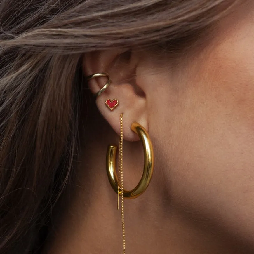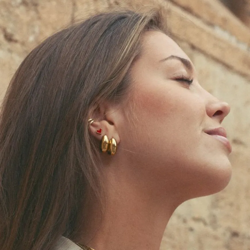 Red Heart Stud Earring Stainless Steel er et par stilige og fargeglade øredobber som kombinerer en knallrød farge med en gyllen glans. Perfekte til å gi ethvert antrekk et friskt uttrykk, er disse små, lekne øredobbene laget av 100 % rustfritt stål med 14k gullbelegg, noe som gjør dem både slitesterke og vanntette.