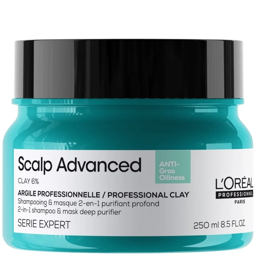 L’Oréal Professionnel Scalp Advanced Anti-Oiliness 2-in-1 Deep Purifier Clay er et 2-i-1 produkt, som kan brukes som shampoo og hårmaske laget for hodebunn somer oljete, tilstoppet og krever målrettet ekspertise. Allsidig tekstur: frigjør produktrester, svette og olje når den brukes som shampoo og renser produktrester, svette og olje når den brukes som hårmaske. Håret føles lett med ekstra volum.