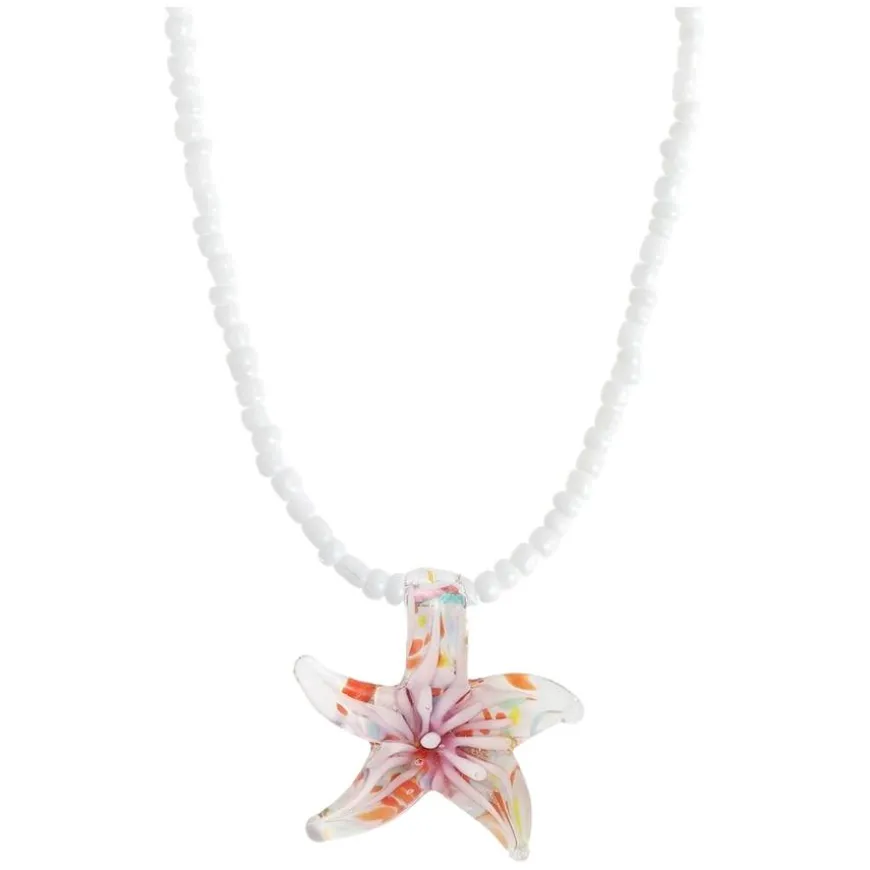 Serafina Glass Starfish Necklace Purple Glaze er et smykke fylt med solskinn og leken energi. Den håndlagde sjøstjernen i lilla glass og det perlede kjedet med små hvite glassperler skaper en avslappet, men iøynefallende stil. Perfekt for deg som ønsker å bære en gyllen times stemning – uansett vær og årstid. Et smykke som gir deg feriefeeling hele året. Laget av Happy People og fri for nikkel, kadmium og bly.