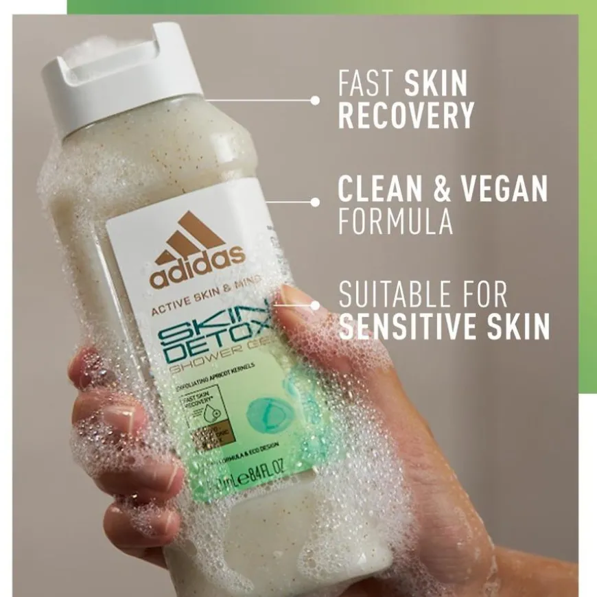Shower Gel Active Skin & Mind Skin Detox er en dusjsåpe for men som tilbyr mild eksfolierende kroppsvask med naturlige aprikoskjerner som fjerner overflødig svette og forurensninger fra huden. Dens glycero-hyaluronsyre kompleks gir rask hudfuktighetsgjenoppretting etter dusjing. Gjør ditt beste under treningen med Adidas dusjsåpe fra Active Skin & Mind-serien. Utviklet sammen med idrettsvitere, er de høyeffektive formuleringene designet for å fornye din daglige pleierutine. Den rene og veganske formelen passer til selv den mest sensitive huden. 100% resirkulert flaske (unntatt tilsetningsstoffer, kork og etikett).