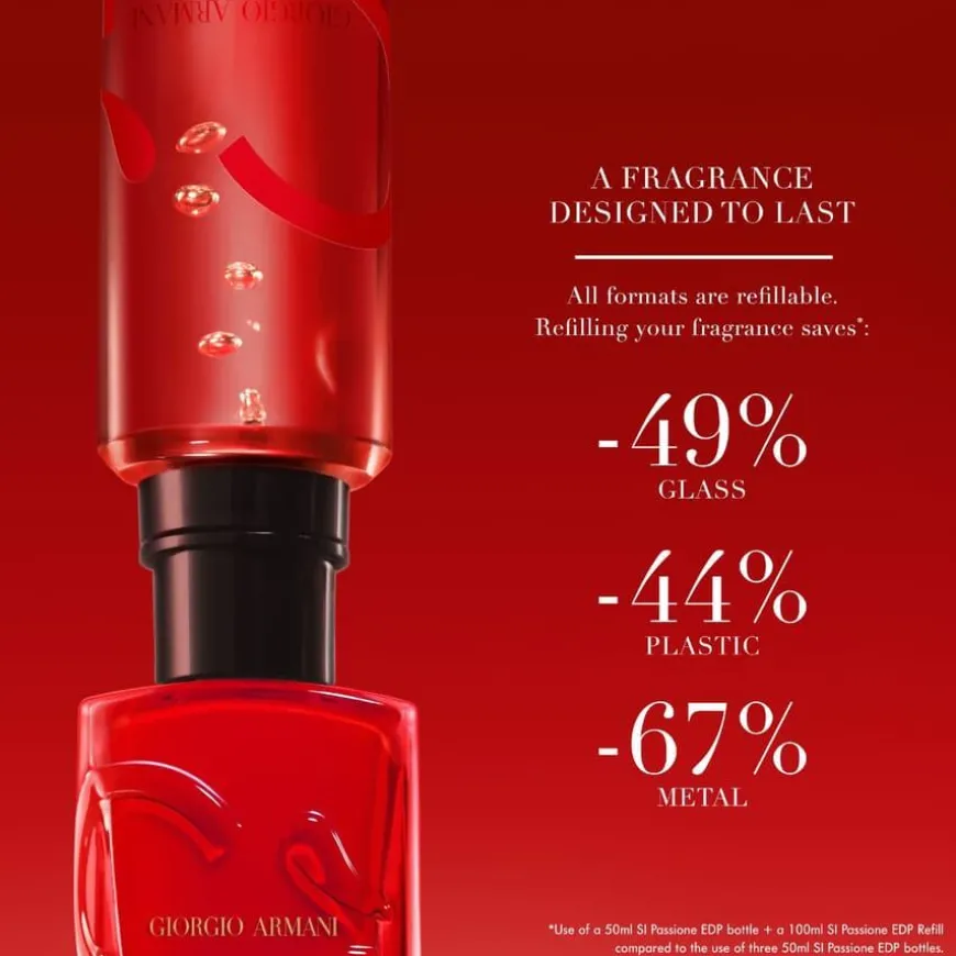 Rødflasken symboliserer lidenskap og vitalitet, og den refillbare designen reflekterer Armanis forpliktelse til bærekraft.