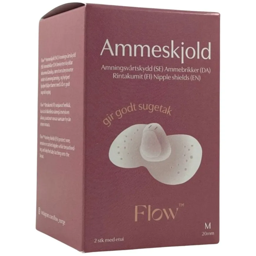 Flow ammeskjold i silikon m/praktisk oppbevaringsboks beskytter ømme, såre brystvorter under amming samtidig som de hjelper babyen med å få godt sugetak. Amming er en helt spesiell opplevelse for deg og babyen din, men det kan være vanskelig eller smertefullt å få sugetak hvis du har tørre eller sprukne brystvorter, flate eller innsunkne brystvorter. Flow ammeskjold hjelper deg ved å beskytte de følsomme brystvortene under amming. De er formet som en sommerfugl og sitter godt på brystet, materialet er gjennomsiktig, ultratynn og myk silikon som er behagelig mot følsom hud. Den unike formen på skjoldene gjør at babyen merker din hud/duft under ammingen, dermed opprettholdes den viktige hudkontakten mellom mor og barn. Den myke silikonsmokken er tilpasset munnen til babyen, den får lett tak samtidig som brystvorten er beskyttet. Skjoldene er helt trygge for babyen og uten smak. Godkjent for næringsmidler. Kommer i egen oppbevaringsboks.