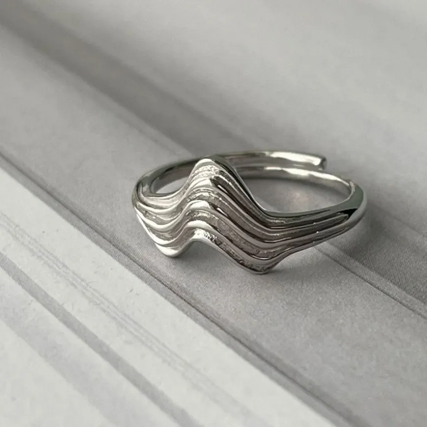 Silke x Sistie ringen i sterlingsølv er designet med en delt bølget overgang fra Silke Kristensens Ocean Waves-kolleksjon, som symboliserer livets opp- og nedturer.