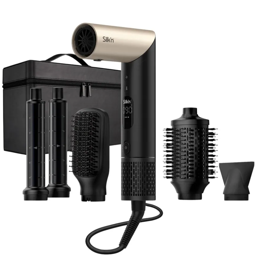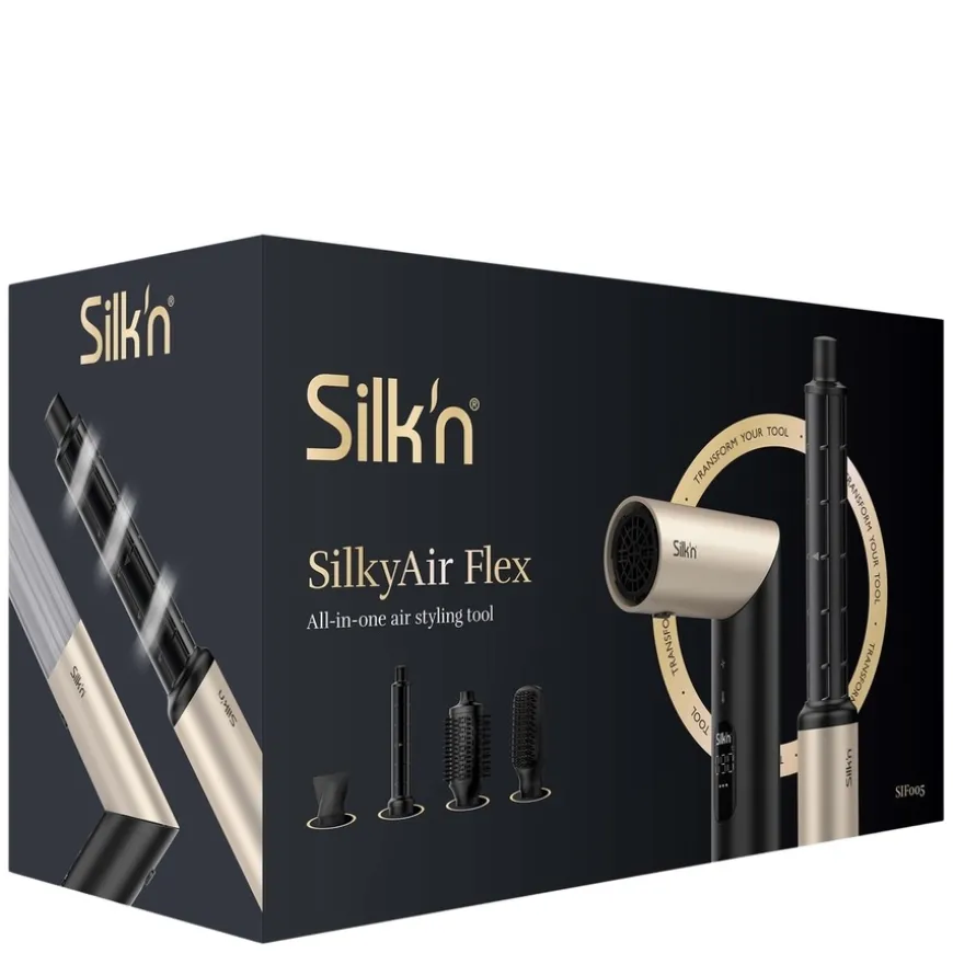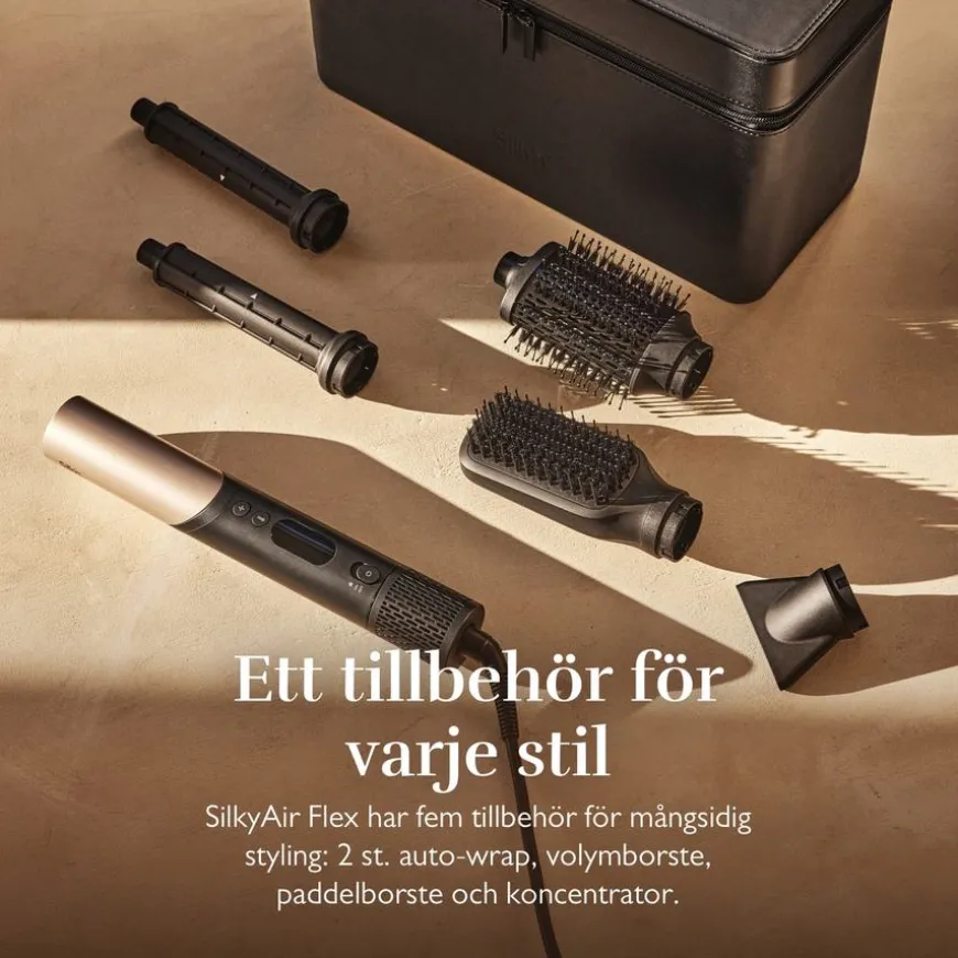Silky Air Flex 5 er et alt-i-ett stylingverktøy. Med den børsteløse motoren og flex-funksjonen forvandles den fra en kraftig hårføner til et alt-i-ett-stylingverktøy. Nå kan du style håret med fire forskjellige temperaturer, tørke håret raskt med den konsentrerte luftstrømmen og med 5 forskjellige tilbehør kan du lage en hvilken som helst frisyre.