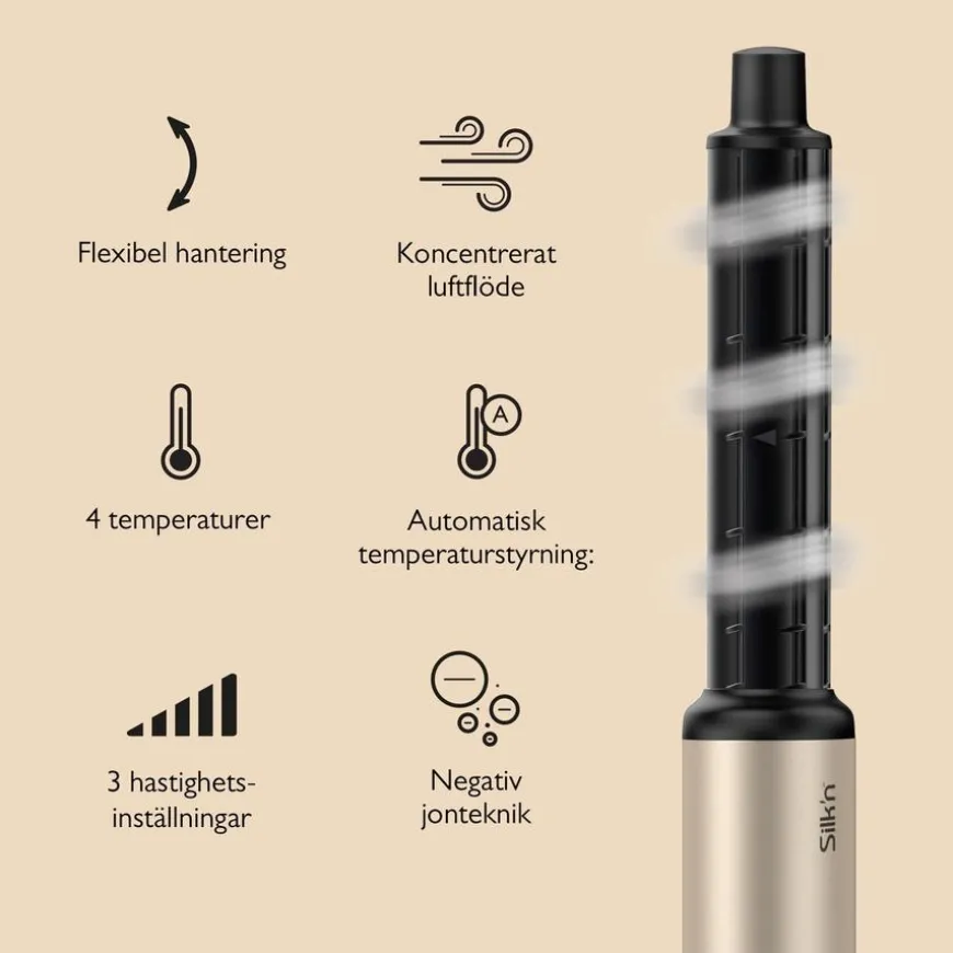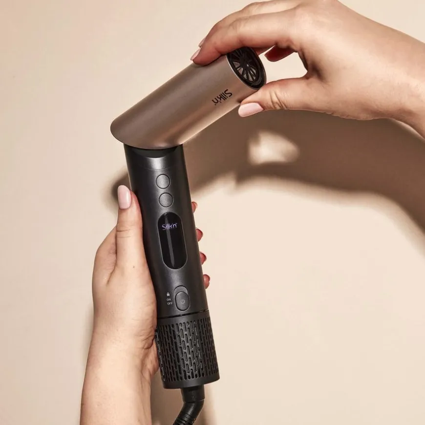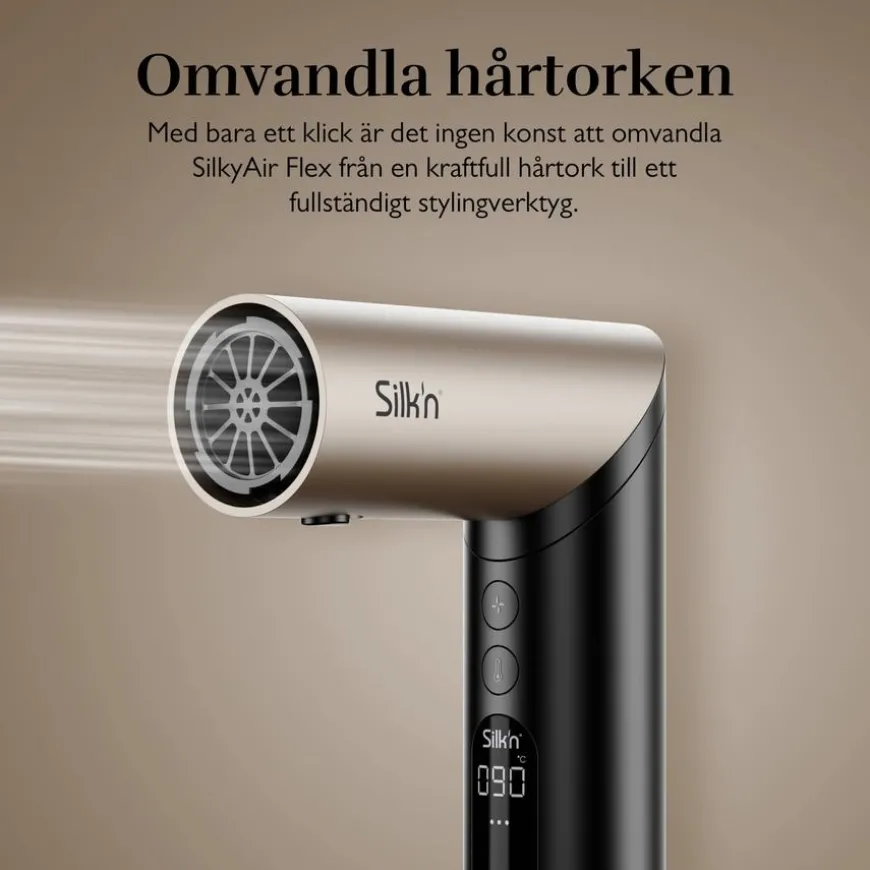 - For å bruke SilkyAir Flex, må du velge ønsket tilbehør basert på stylingbehovet ditt, feste det til enheten og justere temperatur- og luftstrøminnstillingene for å passe hårtype og stylingmål.