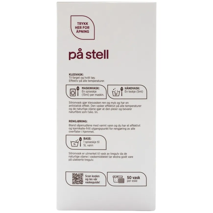 Sitronvask er et universalmiddel for klesvask og rengjøring. Bruk ett og samme produkt til alt av klesvask i tillegg til generell rengjøring av hjemmet, bilen og båten. Den gjør klesvasken ren og myk og har en antistatisk effekt – med en naturlig duft av sitron. Den vasker effektivt på alle temperaturer over 40 grader og de naturlige oljene gjør at den også pleier og bevarer materialer som f.eks lin.