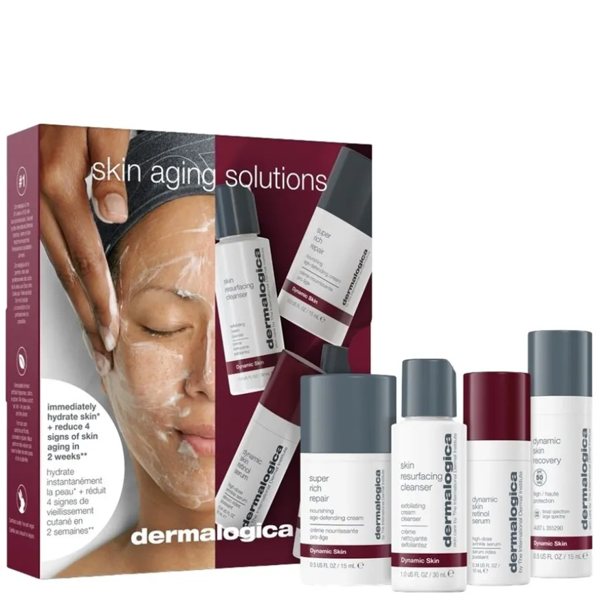 Skin Aging Solutions Set er et sett fra Dermalogica som inneholder 4 produkter spesielt utviklet for å motvirke og bekjempe tegn på hudaldring. Settet gir en komplett hudpleierutine som renser, reparerer og beskytter huden for et sunnere og mer ungdommelig utseende.