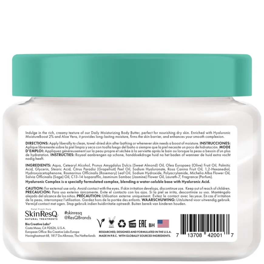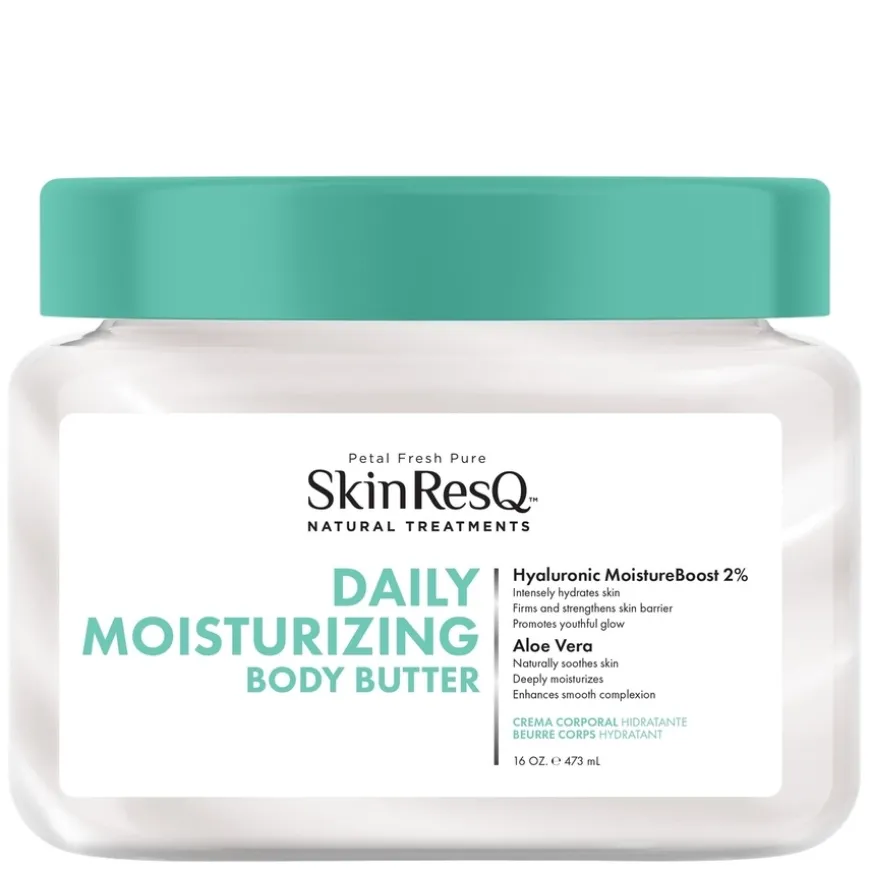 Skin ResQ Daily Moisturizing Body Butter er en rik og kremete body butter som tilfører intensiv fuktighet og næring. Formulert med 2 % Hyaluronic MoistureBoost og beroligende aloe vera, som sammen gir langvarig fukt og styrker hudbarrieren. Hyaluronsyre bidrar til å binde fukt i huden, mens aloe vera virker lindrende og revitaliserende. Inneholder også naturlige oljer som mandel- og olivenolje for ekstra pleie. Passer for tørr og dehydrert hud, samt sensitiv hud som trenger beroligende effekt. Etterlater huden smidig, glatt og gjennomfuktet hele dagen.