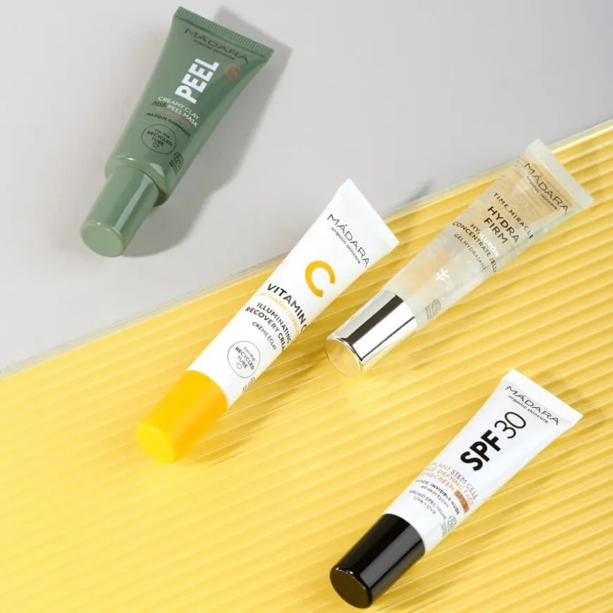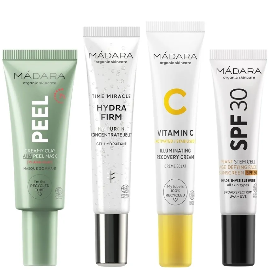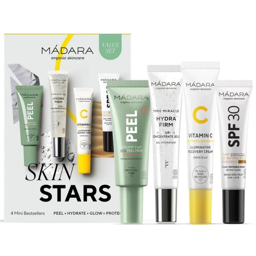 Skin Stars 4 Mini Bestsellers Set er et hudpleiesett med fire miniatyrprodukter som gir dyp fukt, glød og beskyttelse. Dette nøye utvalgte settet inneholder alt du trenger for en komplett hudpleierutine, enten du er ny til økologisk skjønnhet eller ønsker å teste nye produkter. Settet inkluderer en mild eksfolierende AHA-peelingmaske, en fuktighetsgivende hyalurongel, en opplysende C-vitamin-krem, samt en anti-age ansiktssolkrem med SPF30 og plantebaserte stamceller. Perfekt som introduksjon til Madaras hudpleieunivers, eller som gave og reisekit. Passer for alle hudtyper.