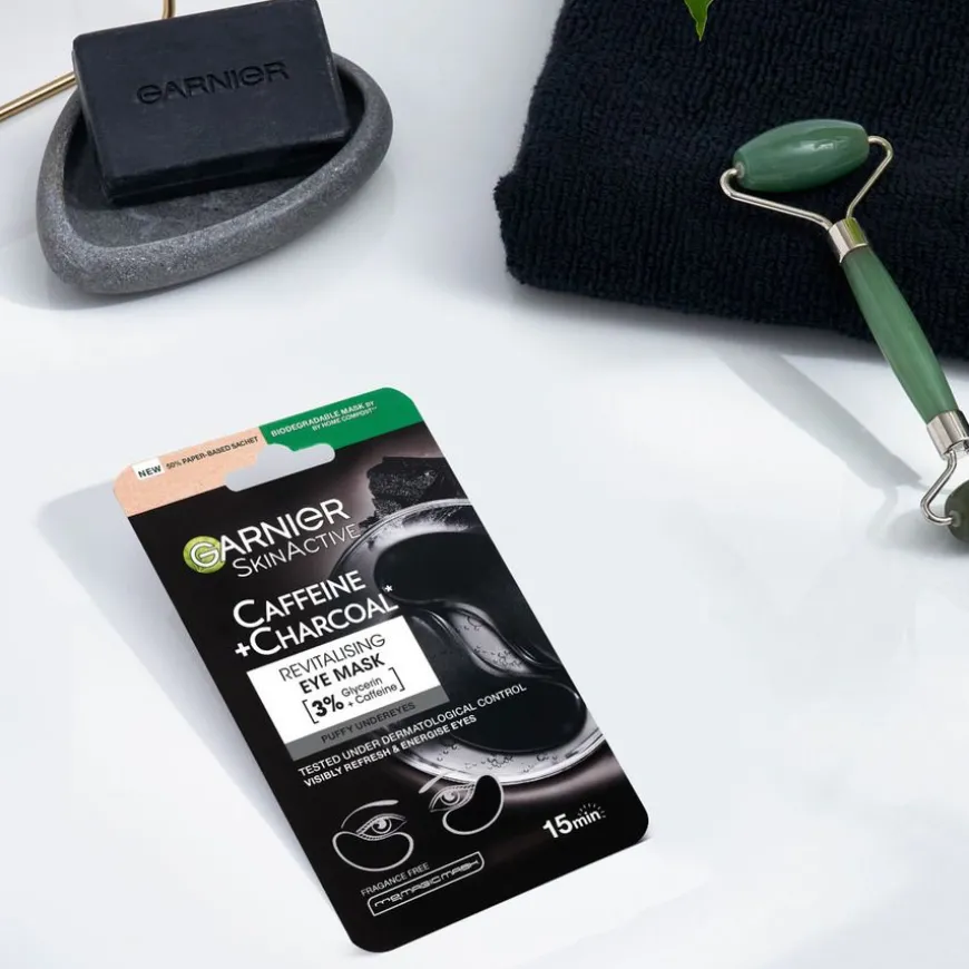 SkinActive Caffeine + Charcoal Eye Mask er en øyemaske som motvirker poser under øynene og frisker opp øyeområdet umiddelbart. Øyemasken er beriket med 3 % glyserin + koffein. Masken kommer i form av pads.