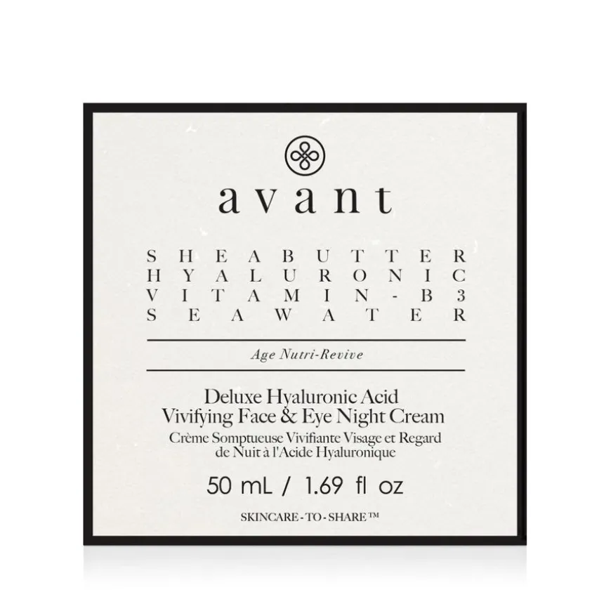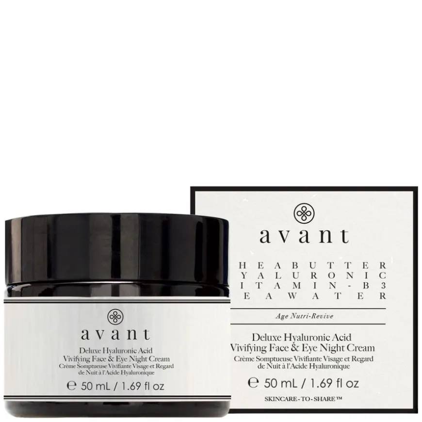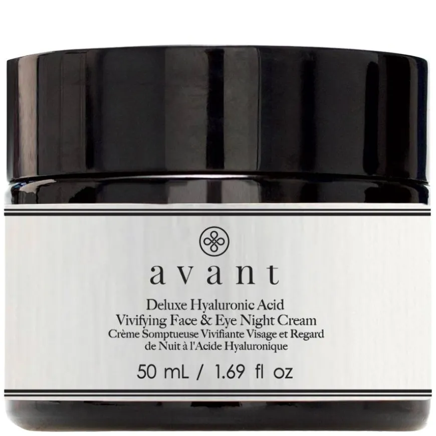 Avant Skincare Deluxe Hyaluronic Acid Vivifying Face & Eye Night Cream er en anti-age fuktighetskrem for ansiktet og det delikate øyeområdet, formulert med hyaluronsyre som dypt nærer huden. Den kombinerer nøkkelingredienser for å forbedre utseendet på store porer, ujevn hudtone, fine linjer, livløs hud og en svekket hudoverflate.