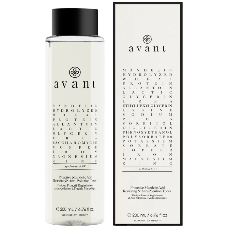 Avant Proactive Mandelic Acid Restoring & Anti-Pollution Toner jobber for å skånsomt eksfoliere, friske opp og stimulere tørr og tilstoppet hud. Denne toneren fjerner de siste restene av sminke og rens, og bidrar til å fjerne alle urenheter fra huden samtidig som den forbedrer hudtonen, strammer porene og umiddelbart gjenoppretter huden etter rens.