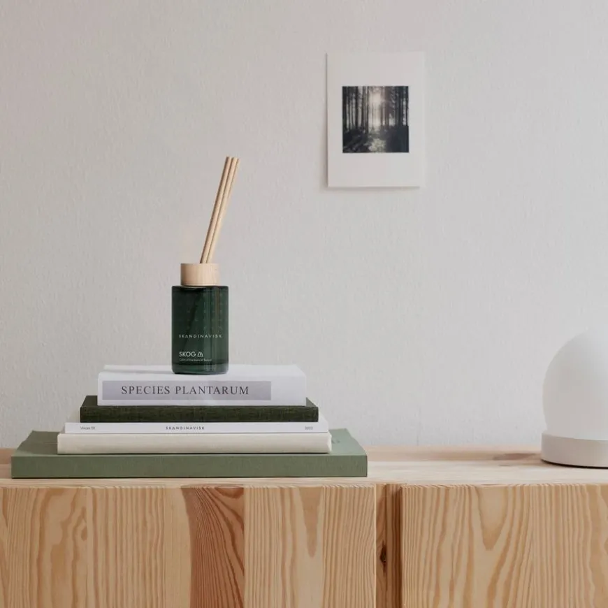 Skandinavisk SKOG Scent Diffuser kombinerer skandinaviske duftfortellinger med vegetabilske oljer fra fornybare kilder, fylt i en malt glassvase. Den har en dekorativ FSC-sertifisert bøketre-ring og åtte høyytelsespinner, som gir en skånsom og bærekraftig romduft i opptil 3 måneder.