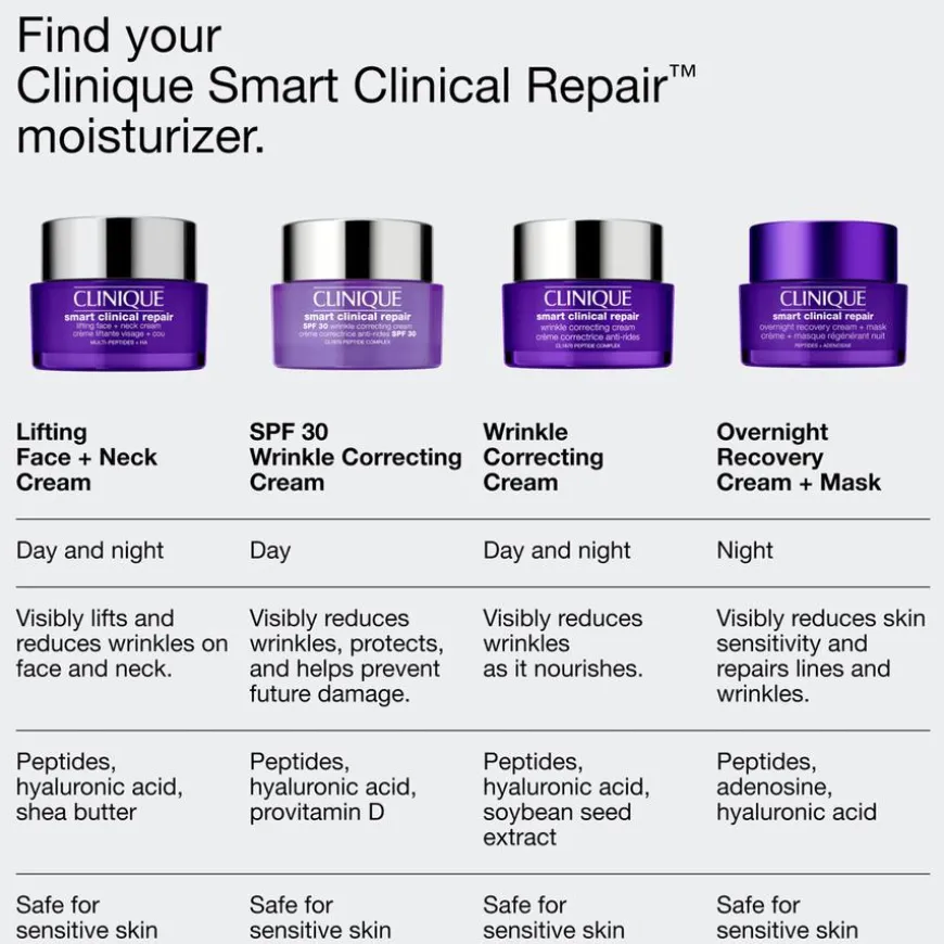 - Påføres på ansikt og hals om kvelden etter bruk av Clinique Smart Clinical Repair™ Wrinkle Correcting Serum.