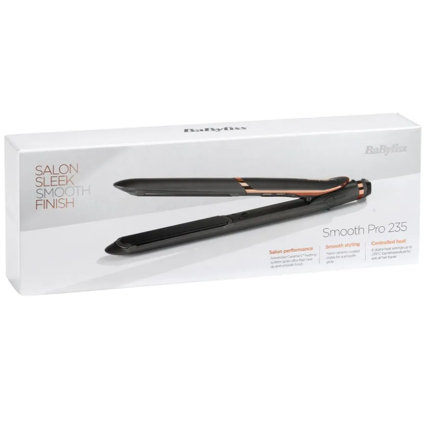 Smooth Pro 235 Straightener er en rettetang som gir et glatt og elegant resultat ved hjelp av glatte, glidende nanokeramiske plater og ionteknologi. Profesjonelt varmesystem gir rask oppvarming opptil 235 °C med trinnløs varmeregulering, velegnet for alle hårtyper og med bedre varmebeskyttelse.