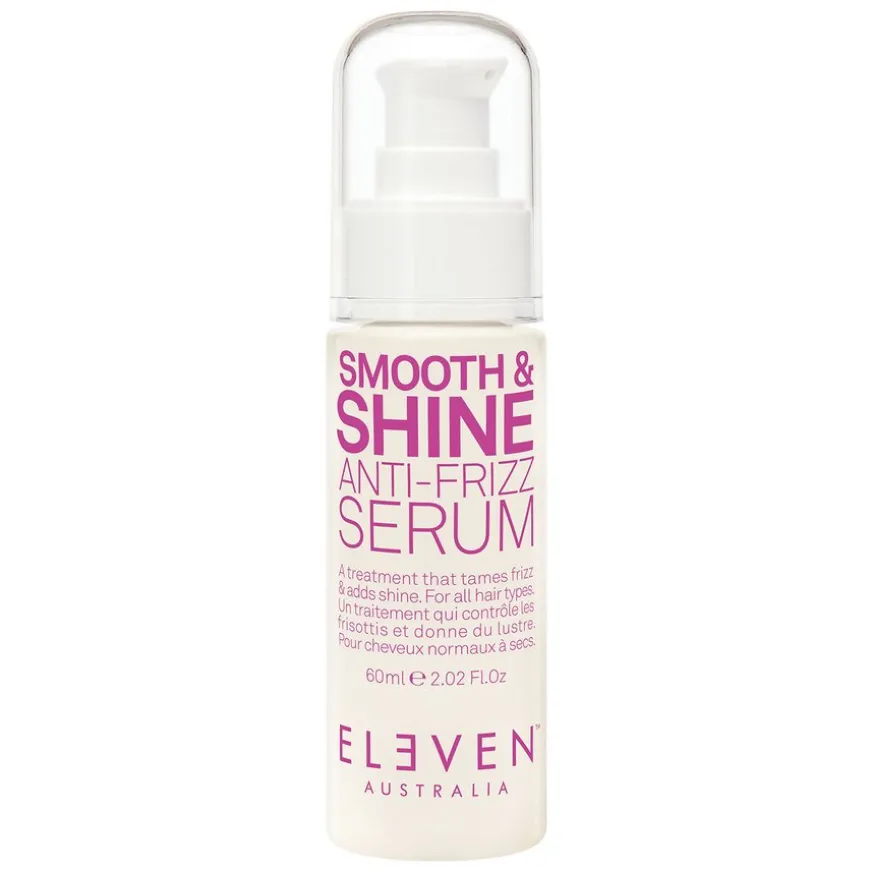 Eleven Australia Smooth & Shine Anti Frizz Serum er et serum for deg som ønsker å bekjempe frizz og gi glans til håret. Inneholder arganolje som kontrollerer det mest ustyrlige håret og gir mykhet og glans. Cruelty Free. Påfør 1-2 pump i hendene, og før dem gjennom håret fra midtlengdene til tuppene. For en enda smoothere finish på tykt hår kan du påføre den i fuktig hår og føne den inn.