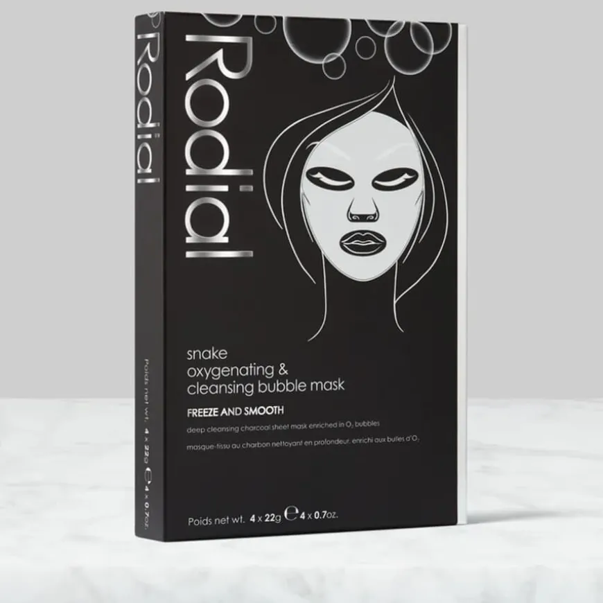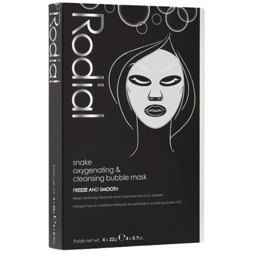 Snake Oxygenating & Cleansing Bubble Mask er en dyprensende sheet-mask fra Rodial som gir huden et øyeblikkelig løft i glød og friskhet. Når masken aktiveres, dannes oksygenbobler som effektivt fjerner smuss, døde hudceller og overflødig olje. Den inneholder trekull som renser tilstoppede porer, samt kollagen, ceramid, vitamin A og E og peptider som gir huden næring og en mer levende glød. Den innovative SYN®-AKE tripeptiden etterligner effekten av ormegift for å jevne ut huden, mens hyaluronsyre og niacinamid fukter og styrker hudens struktur. Passer for alle hudtyper.