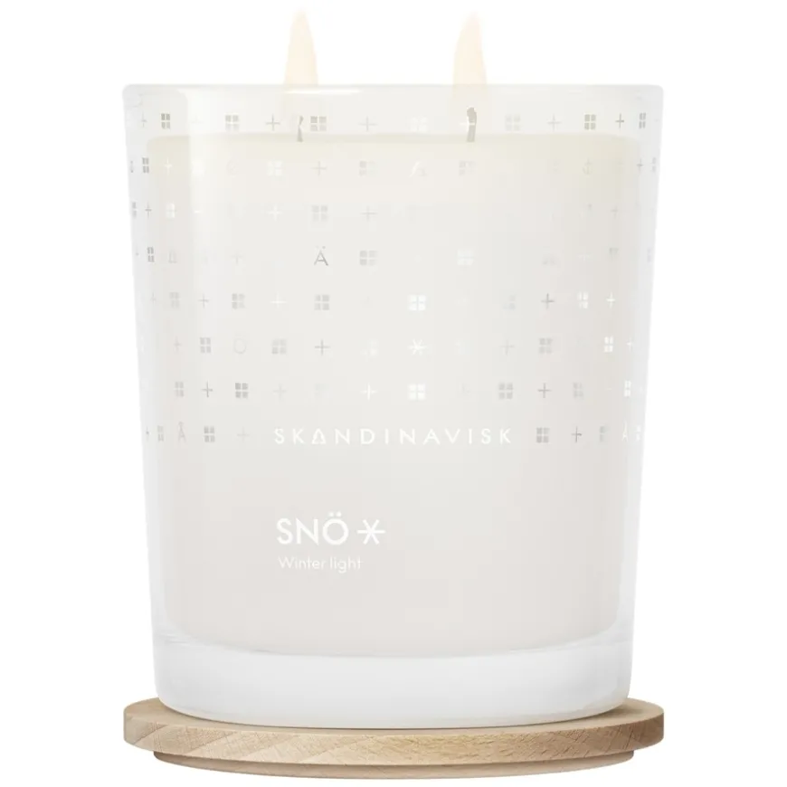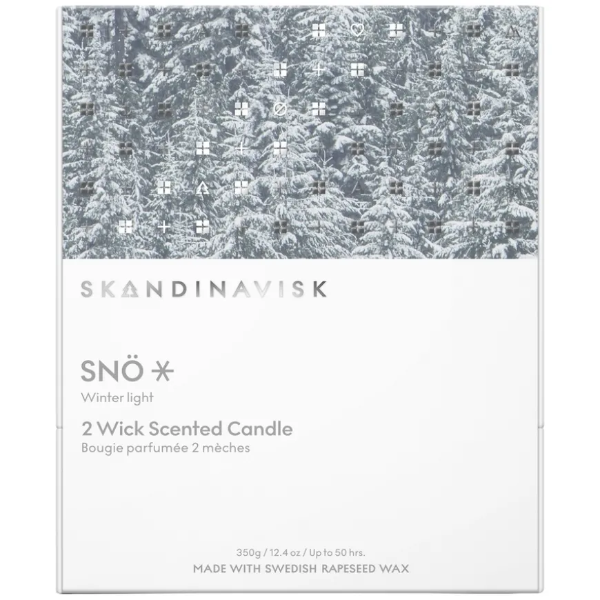 Skandinavisk SNÖ Scented Candle Special Edition med tovekes duftlys i sesongdesign og hard gaveeske. Voksen er laget av svensk rapsolje som er bærekraftig dyrket og ikke-GMO, og blandet for å brenne jevnt og sakte med lavest mulig miljøpåvirkning. Vegansk og ikke testet på dyr.