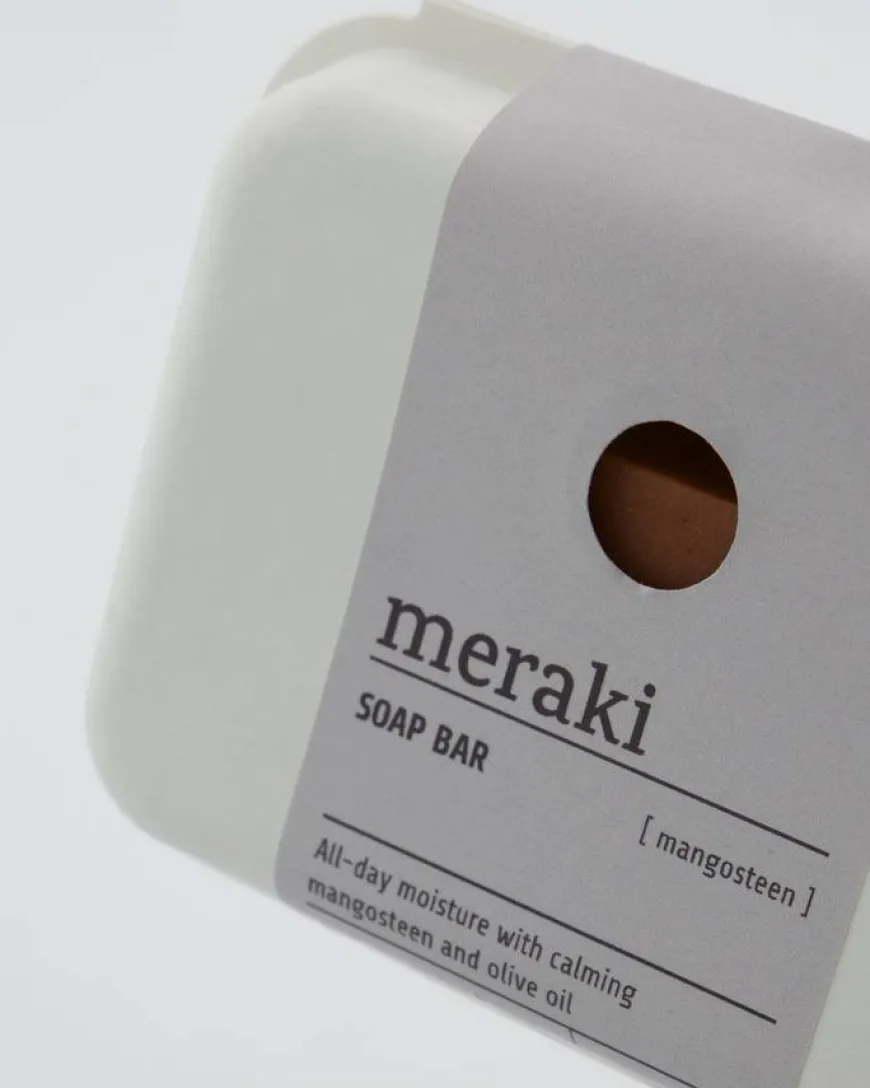 Soap Bar Mangosteen er et såpestykke som gir hendene dine fukt hele dagen med beroligende mangosteen og olivenolje. Denne faste såpen fra Meraki inneholder mangosteen – en liten, eksotisk frukt med antioksidanter, som beskytter huden mot frie radikaler og har en beroligende effekt. Olivenolje sikrer at huden forblir fuktig hele dagen. Legg såpen i en såpeskål på badet eller kjøkkenet.
