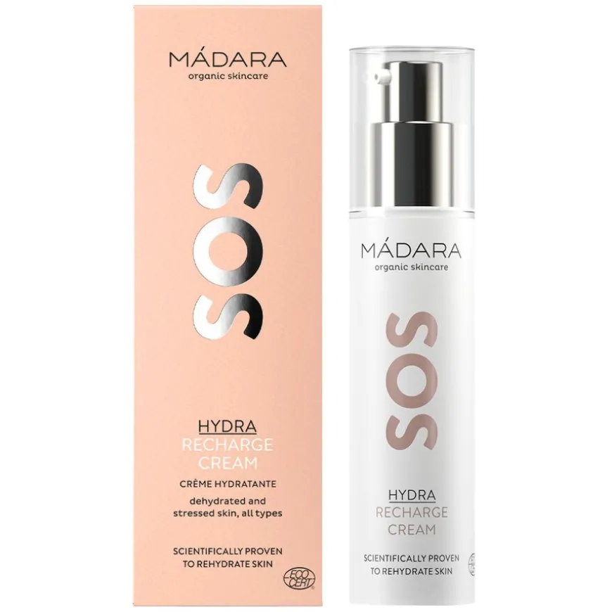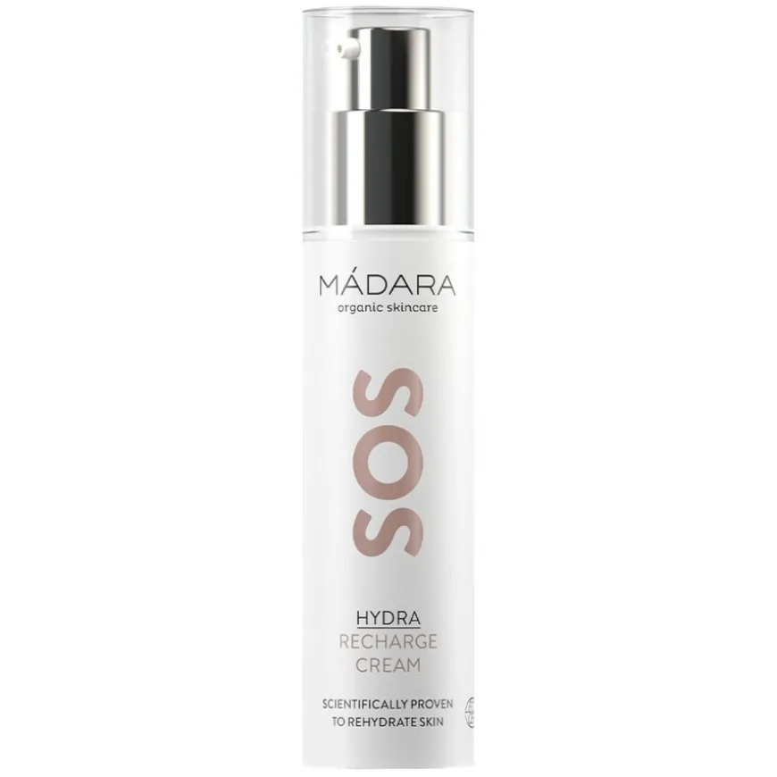 SOS Hydra Recharge Cream er en fuktighetskrem er en intense fuktighetslåsende krem med rynkemotvirkende antioksidanter av nordlig peon, linfrø og hyaluronsyre hydrerer, etterfyller og lindrer dehydrert og stresset hud for å gjenopprette en ungdommelig og strålende hud.