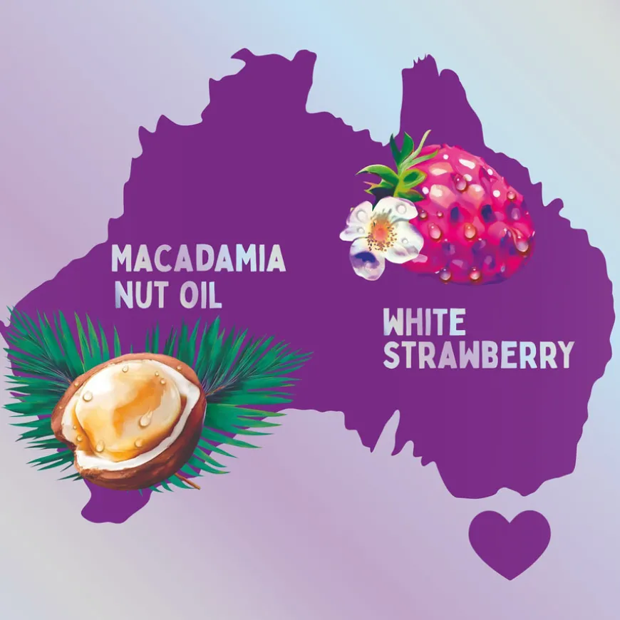 Aqua, Sodium Laureth Sulfate, Cocamidopropyl Betaine, Sodium Xylenesulfonate, Parfum, Sodium Chloride, Citric Acid, Sodium Benzoate, Sodium Citrate, Sodium Salicylate, Limonene, Guar Hydroxypropyltrimonium Chloride, Sodium Hydroxide, Tetrasodium EDTA, Linalool, Macadamia Ternifolia Seed Oil, Histidine, Butylene Glycol, Fragaria Chiloensis Fruit Extract